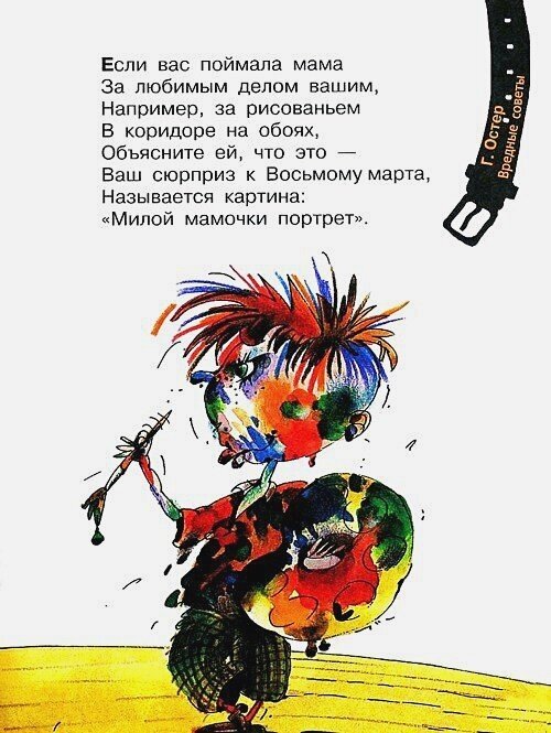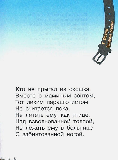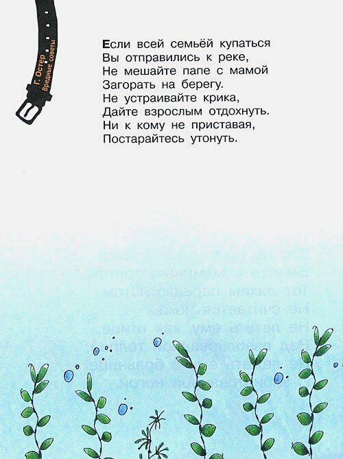 Например, такой: "На улице минус двадцать, не надевай шапку". Как вы думаете ваше ребенок послушается? Скорее всего нет. Засмеется и оденется потеплее, вот в чем смысл "Вредных советов" Г. Остера. Чем их больше, тем веселее будет хохотать ваше чадо, тем меньше глупостей оно сотворит.