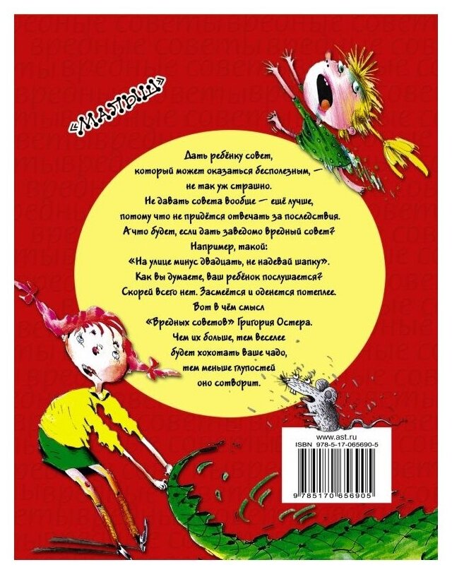 Дочка у меня фанатка вредных советов. Раннее я покупала в книжном магазине книгу "Школьные вредные советы", доче первокласснице сильно понравилось, она ее каждый день не по разу открывала и в школу таскала и вслух на переменке читала, всему классу понравилось, многие стишки выучила наизусть. Она еще много книг Остера приносила из библиотеки... и понимает она все правильно как и написано в описании "Чем их больше, тем веселее будет хохотать ваше чадо, тем меньше глупостей оно сотворит". В конце учебного года выдали листок со списком литературы для чтения летом, среди всего наш любимый Остер, вот и решили прикупить эту книгу. Книга супер, доча прыгала до потолка от счастья! Выбрали именно эту книгу, потому что здесь Все вредные советы) По качеству книга тоже отличная. Очень советуем!!! Деткам такие книжки нравятся!