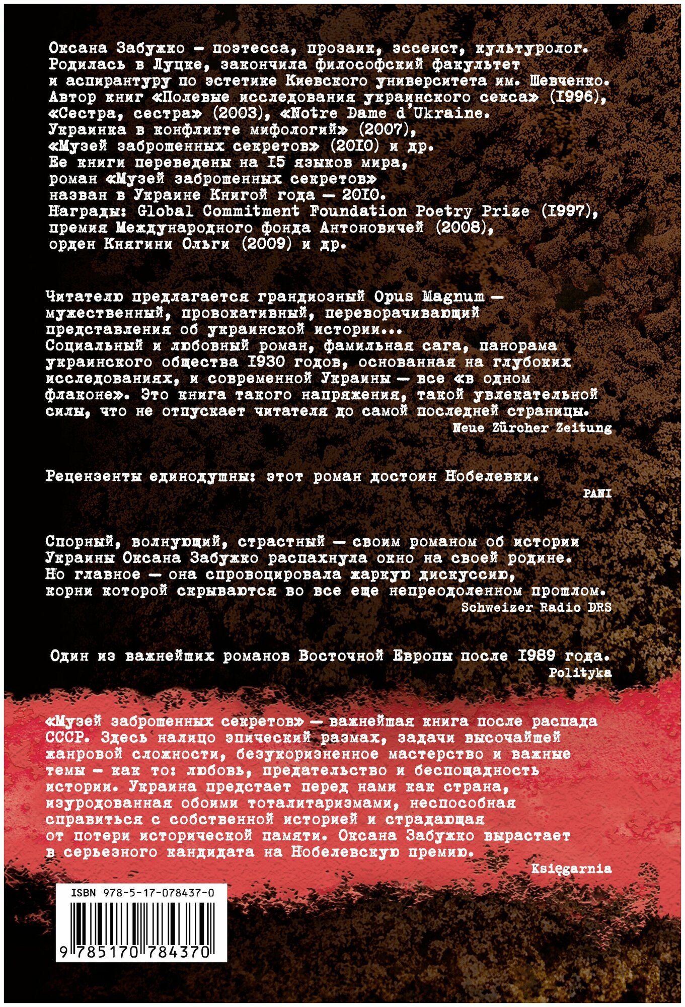 Роман "Музей заброшенных секретов" - украинский эпос, охватывающий целое столетие. Страна, расколотая между Полыней и Советским Союзом, пережившая голодомор, сталинские репрессии, войну, обрела наконец независимость. Но стала ли она действительно свободной? Иной взгляд на общую историю, способный шокировать, но необходимый, чтобы понять современную Украину.