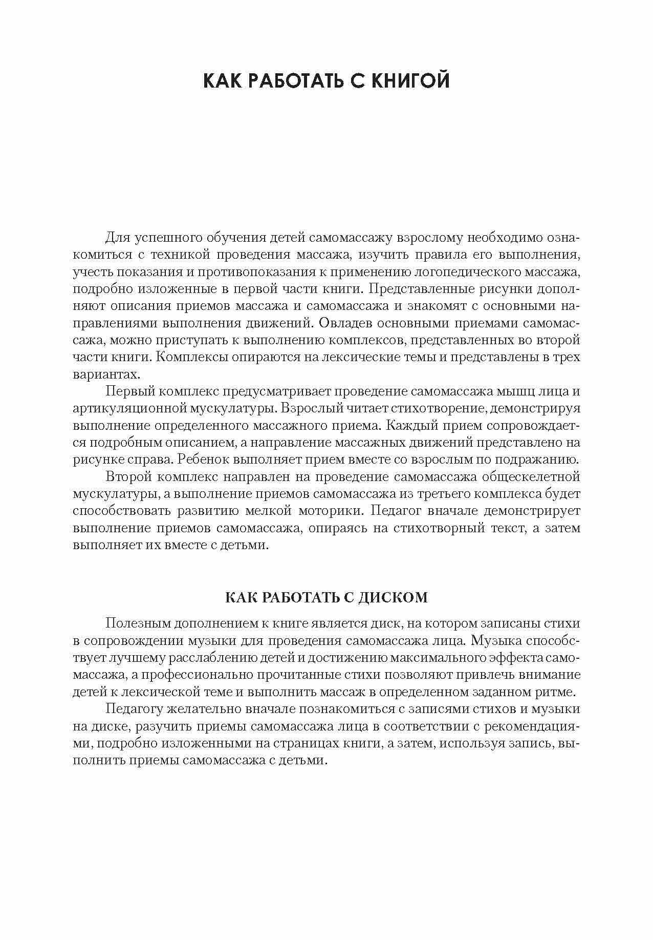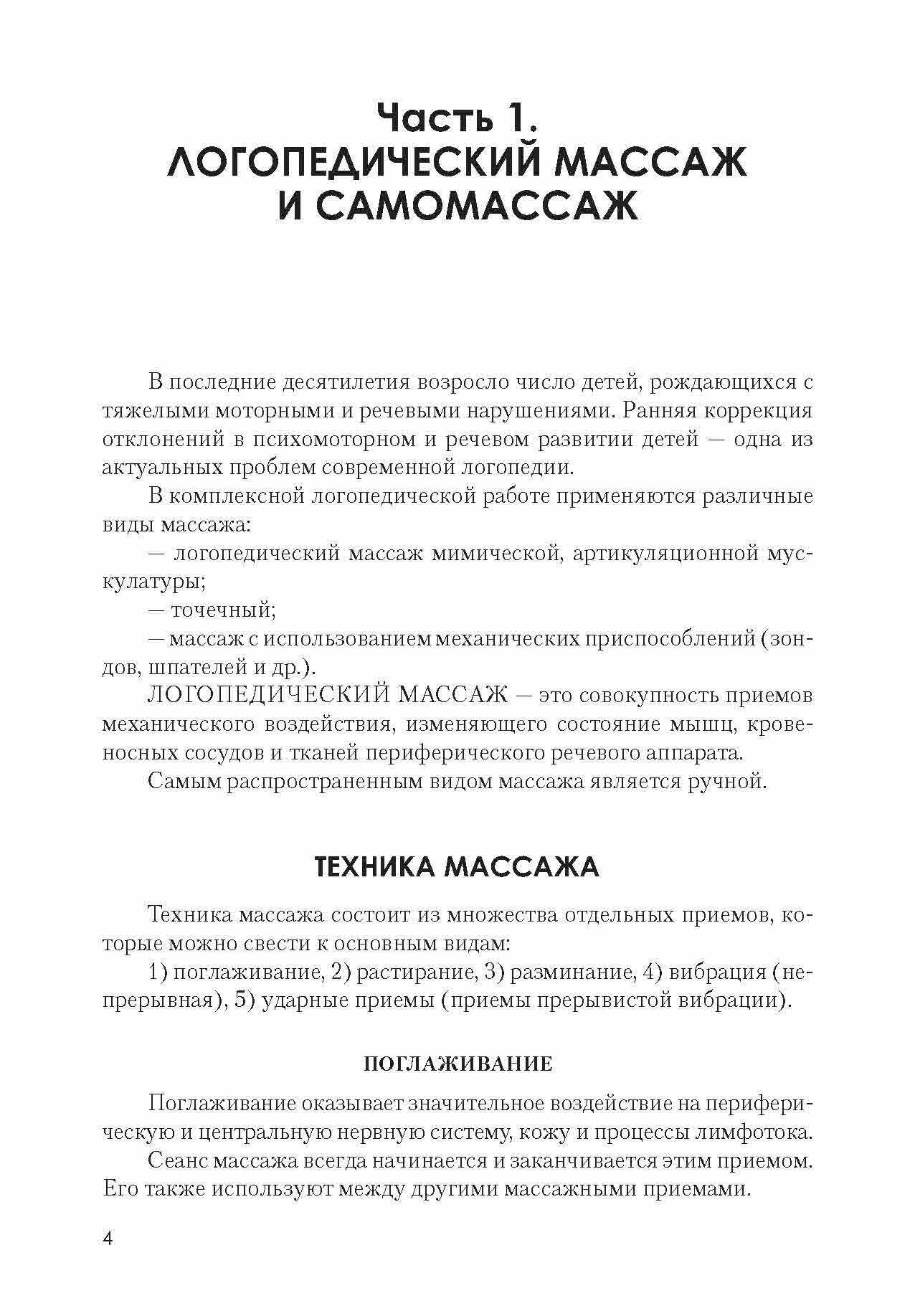 Перед вами книга, в которой, наряду с общими представлениями о логопедическом массаже (видах, приемах и особенностях проведения при различных речевых нарушениях), представлен материал по применению приемов самомассажа в педагогической работе с дошкольниками, а также для проведения самомассажа дома. В своей работе авторы опирались на опыт ведущих специалистов - Е.Ф.Архиповой, Е.А.Дьяковой, Л.В.Лопатиной, Ю.В.Микляевой, О.Г.Приходько. Пособие состоит из двух частей. В первой части авторы рассказывают о технике проведения массажа - его основных видах (приемах); описывают возможные ошибки при его выполнении. Во второй части пособия содержатся комплексы самомассажа, которые представлены в трех вариантах: • самомассаж мышц лица и артикуляционной мускулатуры;• самомассаж общескелетной мускулатуры; • развитие мелкой моторики (самомассаж рук).