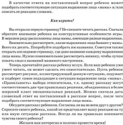 Дорогие родители и дети! Перед вами игра, которая поможет вам научиться лучше понимать друг друга. Как важно знать ребенку, будет ли довольна мама его поступком, мнением, движением души. Как полезно и интересно узнать мамам, каких реакций ожидают от них дети, как они понимают разные житейские ситуации. Играя в эту игру, ребенок научится лучше различать разные эмоциональные состояния и настроения, а проще всего этому учиться "на маме" - самом первом, самом близком человеке. Ребенок научится самостоятельно оценивать разные ситуации и предвидеть реакции своей мамы. Если он чуть-чуть ошибется, игра сама подскажет ему правильное решение. Ребенок узнает, как называются основные человеческие настроения, и научится соотносить название эмоции с выражением лица. Приобретенные в игре знания и некоторый эмоциональный опыт помогут ребенку лучше понимать не только житейские ситуации дома, в школе, во дворе, но и рассказы, фильмы и т. п. Надеемся, что эта игра будет интересна и полезна и детям, и их родителям.