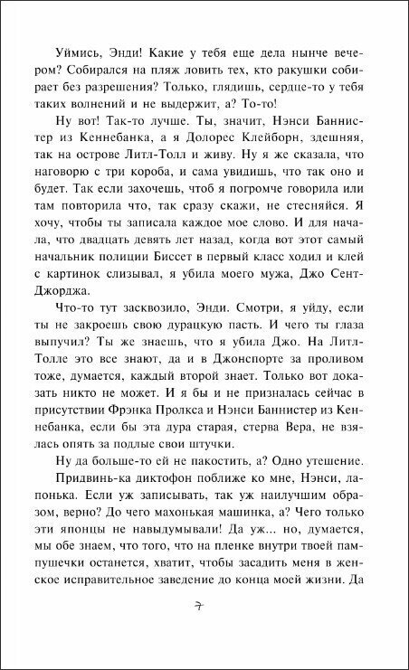 Не знаю как рассказать мнение без спойлеров: описанное в книге мог экранизировать Балабанов (R.I.P), про это может рассказать НТВ в программе Максимум, от мастера ужасов и мистики я такого не ждал. Цельность истории поражает, ни разу не хотелось отложить чтение из-за "скучно", нет моментов которые "промотал из-за соплей" а ведь написано от лица старой Долорес. Со всеми особенностями языка и оборотами, характерными для жителей глубинки или деревни. Браво!