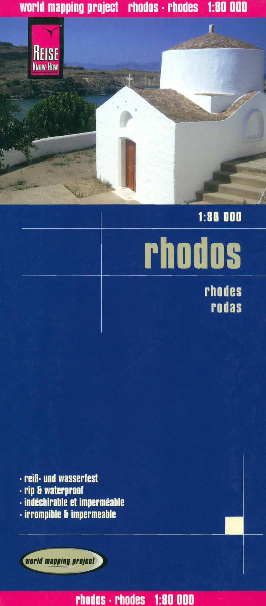 Mapa turistico y de carreteras de Rodas. Grecia. indice de ciudades. Resistente al agua. 70 x 100 cm / Doblado 25 x 10 cm. Escala 1:80.000. Idiomas: Espanol, Ingles, Frances y Aleman. Compatible GPS.