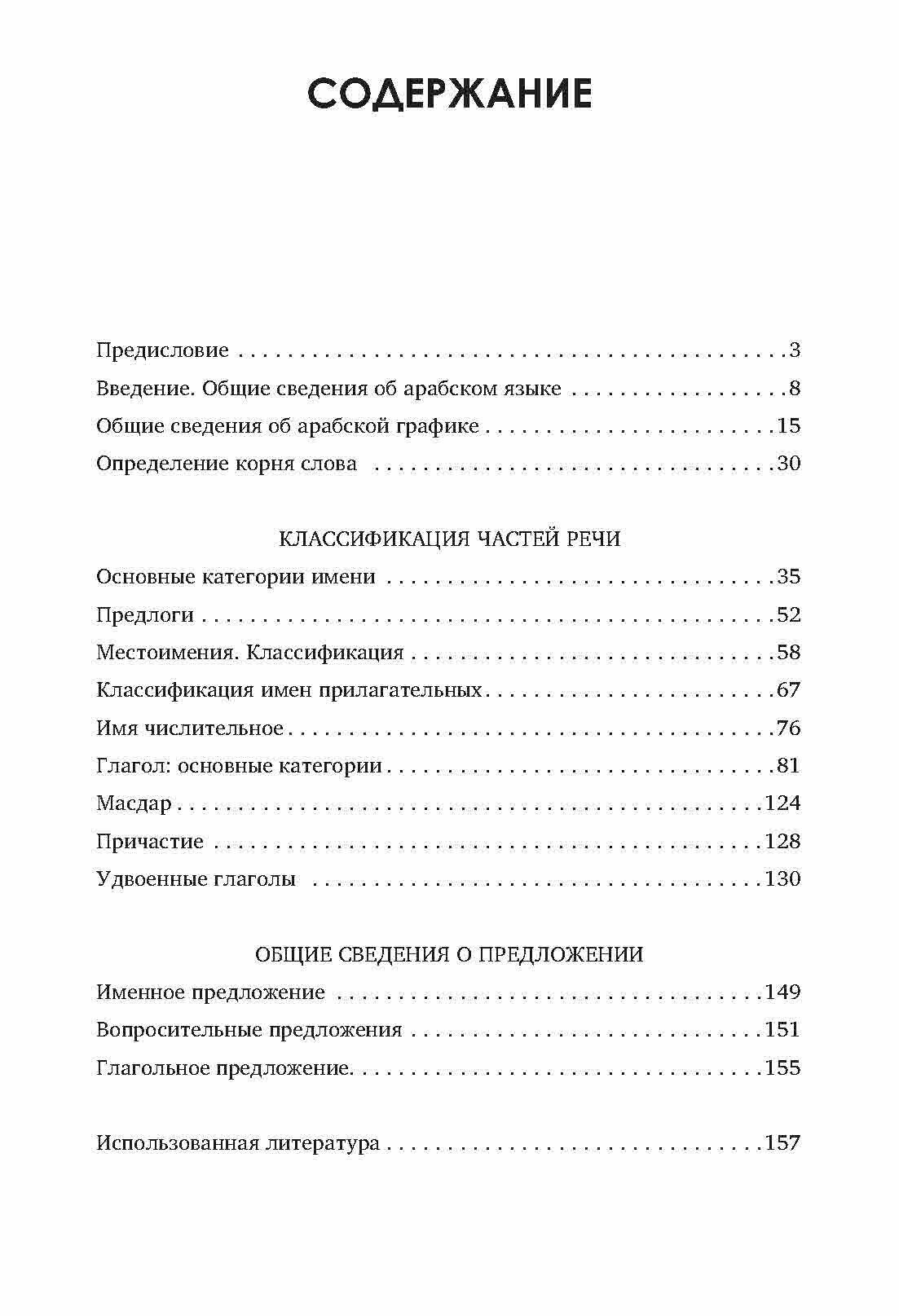 Краткая грамматика адресована тем, кто начинает изучать арабский язык или имеет минимальные знания об арабской графике и фонетике. Так, помимо основных сведений об особенностях структуры корня, в грамматике рассматриваются глаголы и имена, образованные от сильной корневой основы, а также дается информация относительно основных типов синтаксических связей, частиц и предлогов.