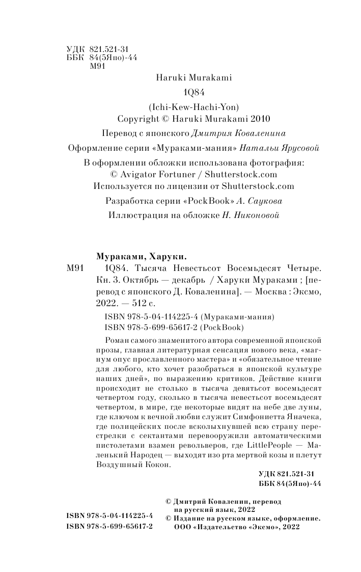 Издание из серии Pocet Book. Меня всегда немного раздражал шрифт со множеством штрихов и зацепок, который отвлекает от сути. Бумага достаточно плотная и непрозрачная, а вот обложка имеет свойство гнуться и трепаться, краска по краям может осыпаться. Любителям Мураками однозначно советую к прочтению - все любимые мотивы угадываются, а сюжет гораздо более серьёзно выстроен, чем в "Норвежском лесу" или "Послемраке". Также книга подойдёт для первого знакомства с его творчеством.