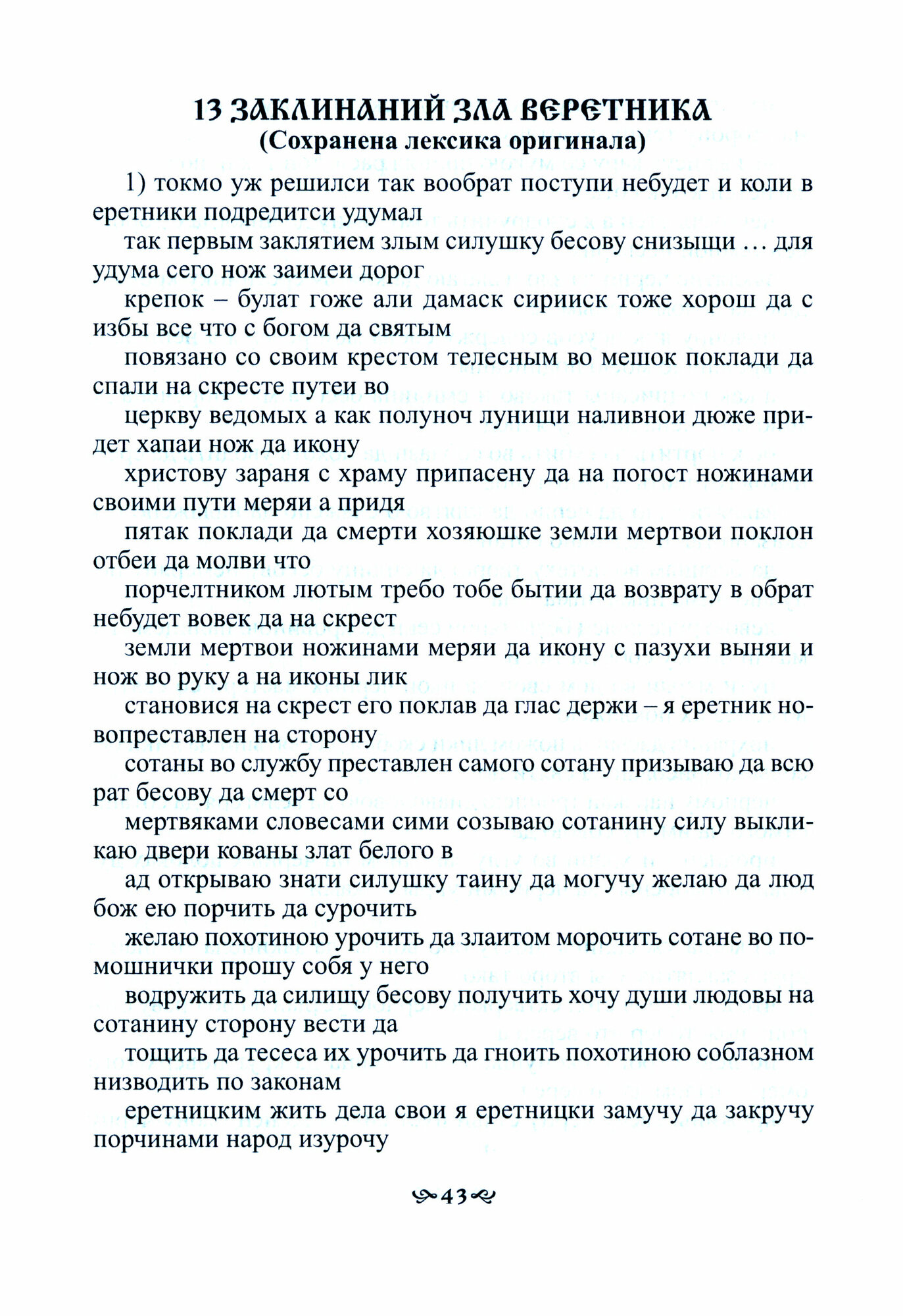Перед нами классический образчик Русского Чернокнижия. Автор описывает веретейнические обряды, и методы довольно сильного, соборного колдовства. Тут вы встретите и методы раскрещивания, и посвящения, и множество видов порч, привороты, отсухи, способы отнятия сил, или здоровья.
