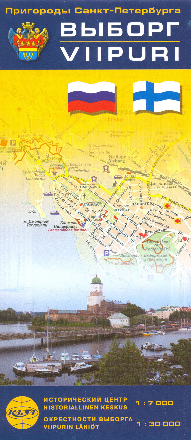 На карте Выборга отмечены памятники архитектуры, исторические укрепления, музеи, храмы, памятники, кафе, пристани, гостиницы, таможенные и пограничные службы, информация для водителей. Дополнительно: время работы музеев, информация о гостиницах, транспорт из Санкт-Петербурга, календарь фестивалей и праздников, указатель улиц.