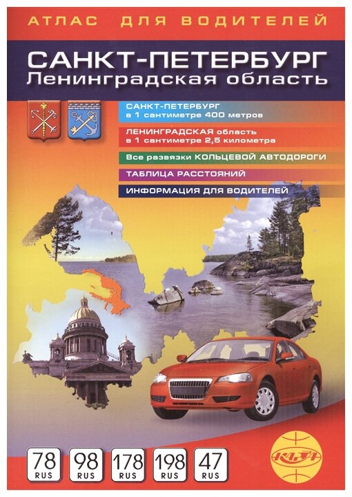 Впервые в одном издании содержатся карты Санкт-Петербурга и Ленинградской области; атлас выполнен в удобном формате. На карте города показана вся Кольцевая автодорога, транзитные проезды, отмечены улицы с односторонним движением и закрытые для движения; объекты сервиса. Подробные схемы транспортных развязок КАД. На карте Ленинградской области показаны все магистральные шоссе и шоссе с твердым покрытием, объекты сервиса и туризма, границы районов области. Атлас дополнен указателями улиц Санкт-Петербурга и населенных пунктов Ленинградской области. Таблица расстояний.