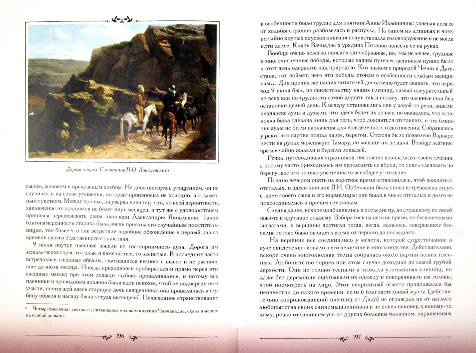 Книга рассказывает об одном из драматических эпизодов Кавказской войны XIX в., когда многочисленный отряд горцев совершил набег на имение Цинандали, принадлежавшее князьям Чавчавадзе, и увел в плен княгинь А.И. Чавчавадзе и В.И. Орбелиани вместе с детьми и прислугой. В Ведено, укрепленной резиденции Шамиля, пленницы провели более восьми месяцев и после длительных переговоров были освобождены в обмен на Джемалэддина, старшего сына Шамиля, и значительную сумму денег.