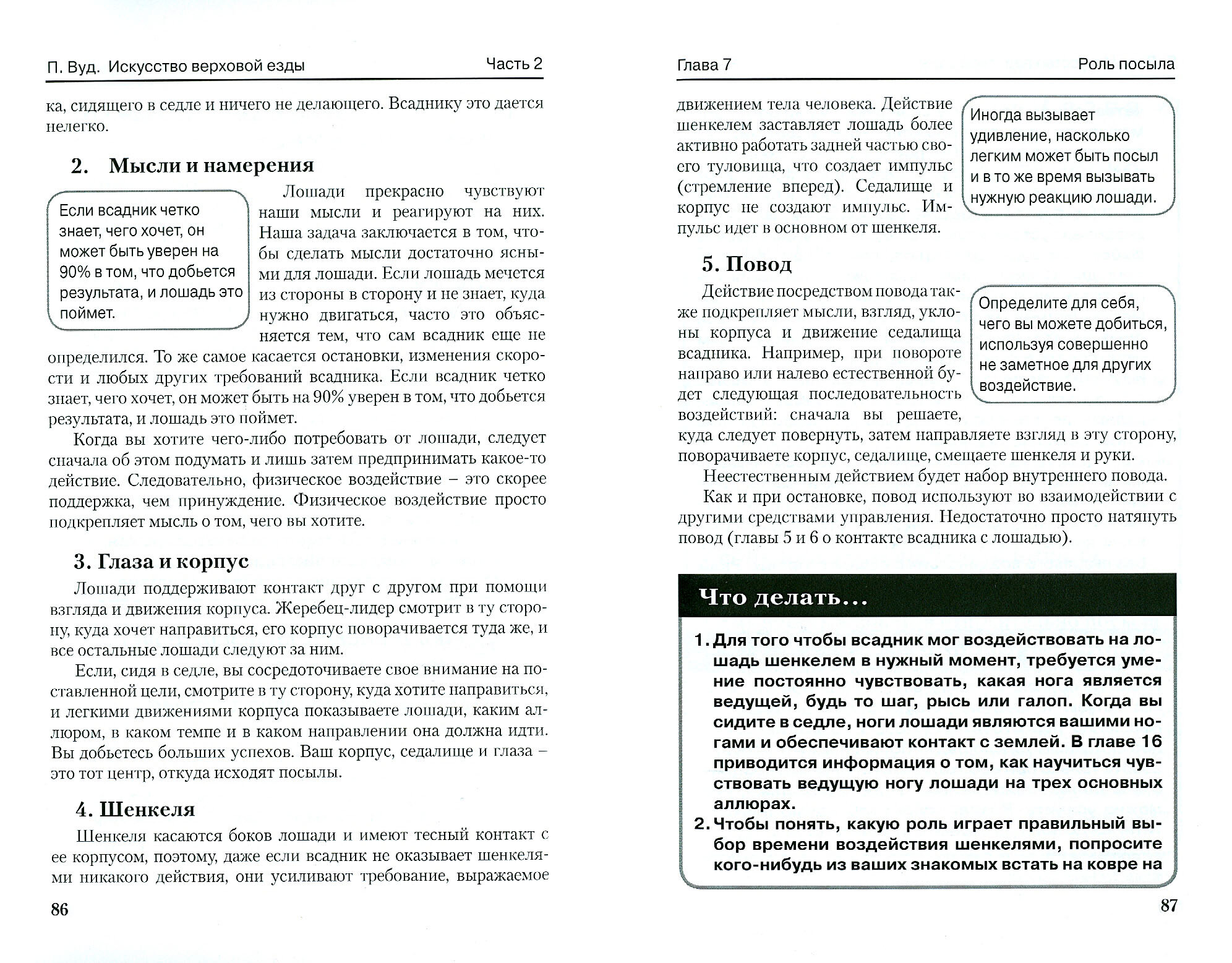 Эту интересную книгу, содержащую много новых идей, заставляющую читателя думать, можно прочитать от корки до корки, но можно и просто просматривать отдельные разделы. В любом случае вы найдете очень интересные сведения о различных аспектах искусства верховой езды.