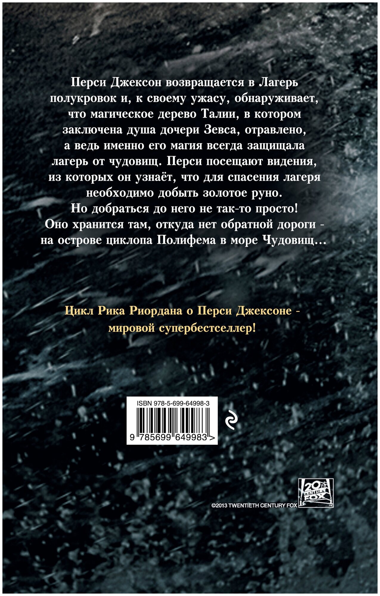 Перси Джексон возвращается в Лагерь полукровок и к своему ужасу обнаруживает, что магическое дерево Талии, в котором заключена душа дочери Зевса, отравлено, а ведь именно его магия всегда защищала лагерь от чудовищ. Перси посещают видения, из которых он узнает, что для спасения лагеря необходимо добыть золотое руно. Но добраться до него не так-то просто! Оно хранится там, откуда нет обратной дороги - на острове циклопа Полифема в море Чудовищ...