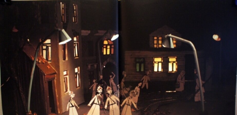 Благодаря оформлению, напоминающему театральные декорации, действие «Двух трамваев» разыгрывается перед вами как будто на сцене, настолько объемными и живыми иллюстрации выглядят на бумаге. Благодаря им с детьми можно не только читать стихи, но и внимательно рассматривать картинки, пытаясь угадать, из чего все сделано.