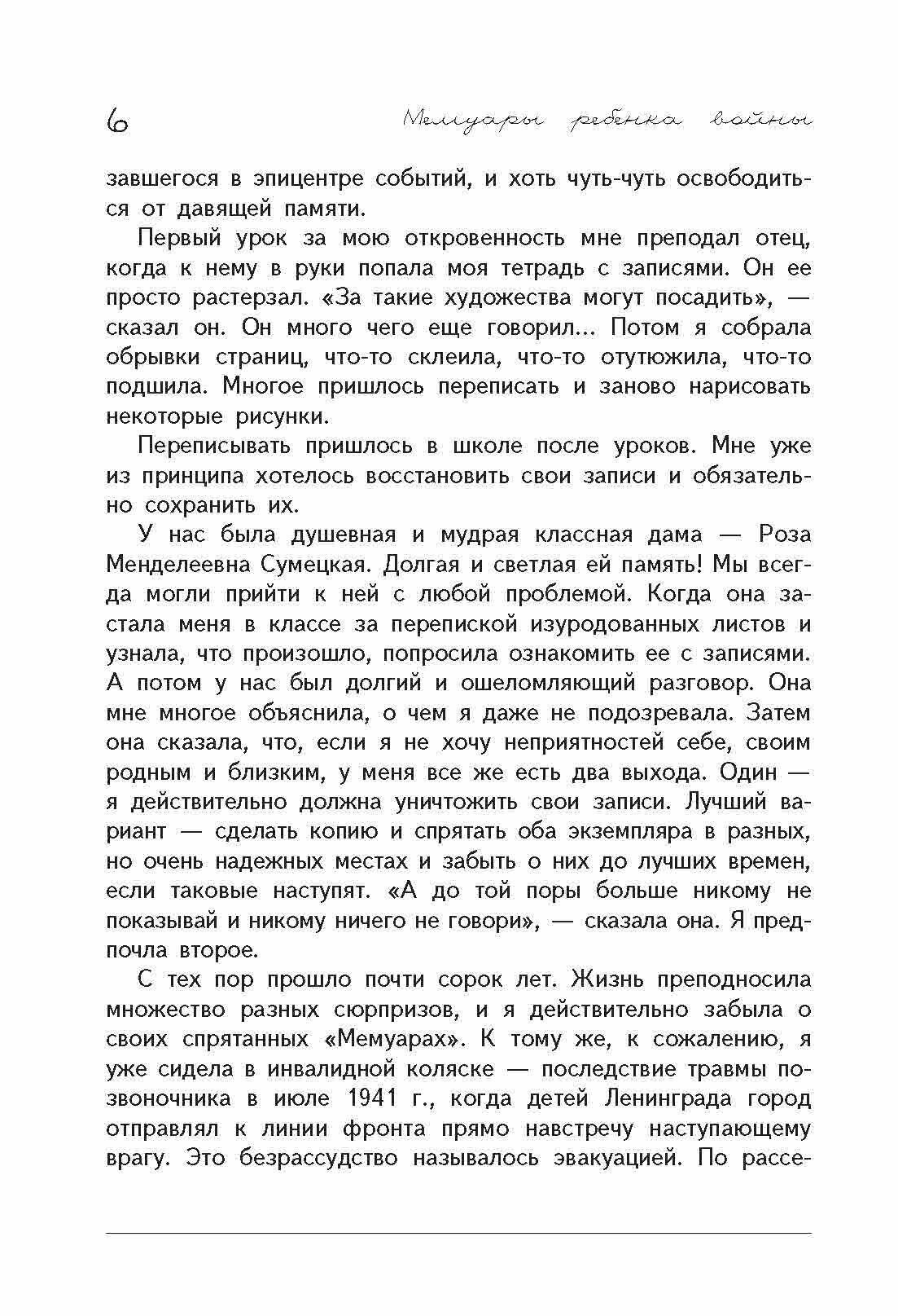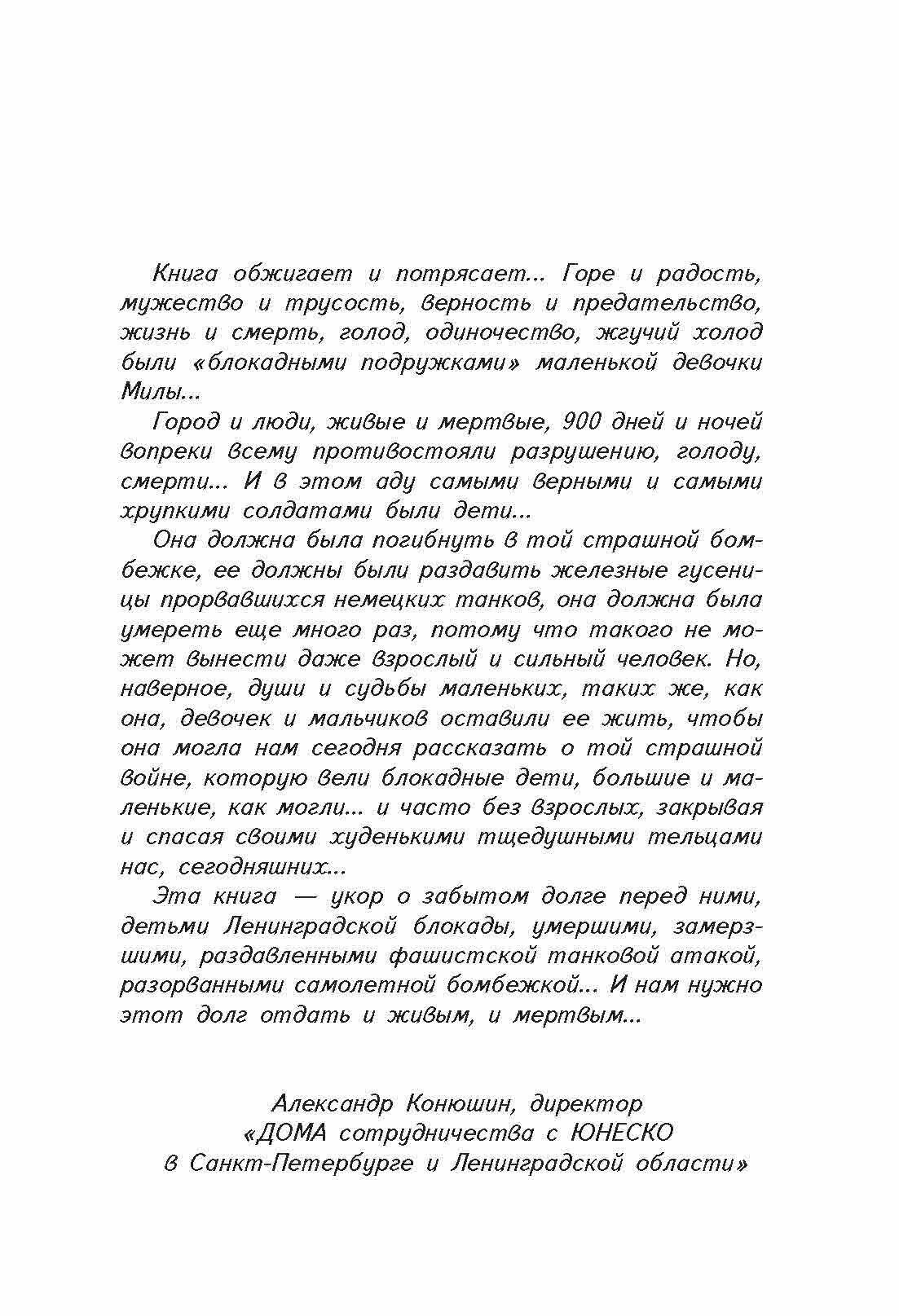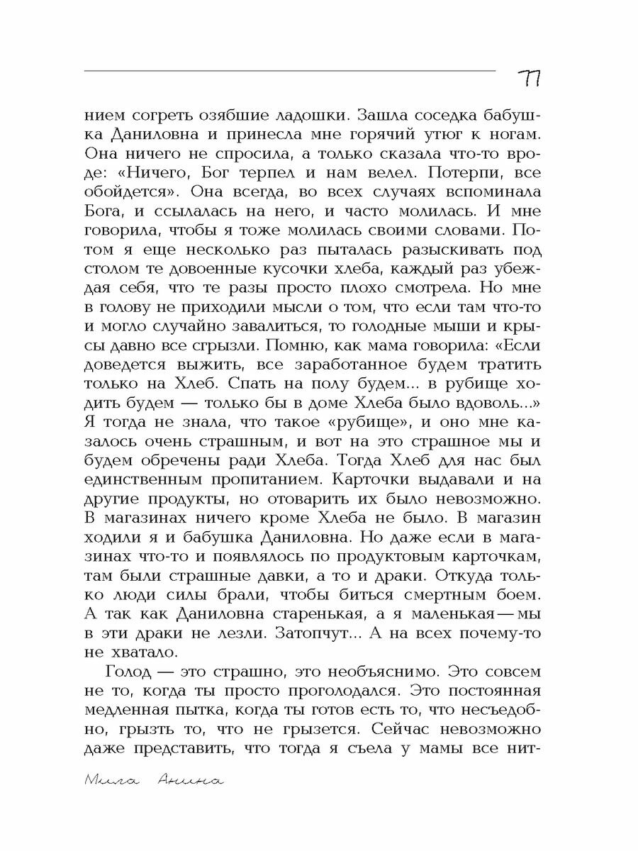 Пронзительная книга! Читаешь, и слезы наворачиваются на глаза. Шестнадцатилетняя школьница случайно услышала разговор о "сытой" блокаде, и это послужило толчком к тому, чтобы написать свои "голодные" воспоминания, пережитые в 7-летнем возрасте. Она писала и сама рисовала рисунки, сочиняла стихи, выплакивая на бумагу все свои душевные нечеловеческие переживания, свою боль, которая живет в сердце до сих пор. Сколько пришлось на долю этой девочки, которую война лишила детства! Сколько раз она оказывалась на грани жизни и смерти! Отец увидел ее мемуары, накричал, что она хочет всех погубить, порвал все в клочья. Что -то удалось разгладить и склеить, что-то пришлось переписывать. Делала она это в школе, за этим занятием ее застала учительница (очень хороший и понимающий человек). Она объяснила Миле, что сейчас эти записи никому показывать нельзя. Есть 2 варианта - уничтожить их или спрятать до лучших времен. Мила выбрала второй вариант. 40 лет ее тетрадки пролежали вдали от людских глаз...