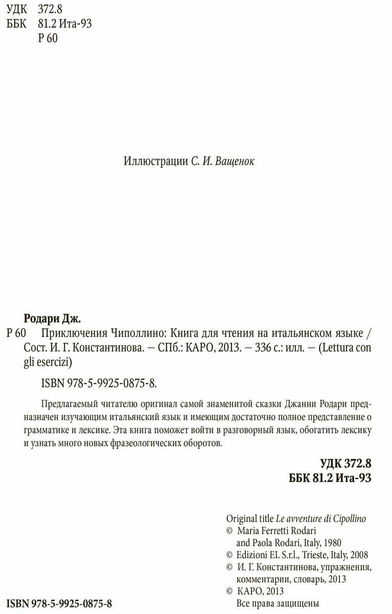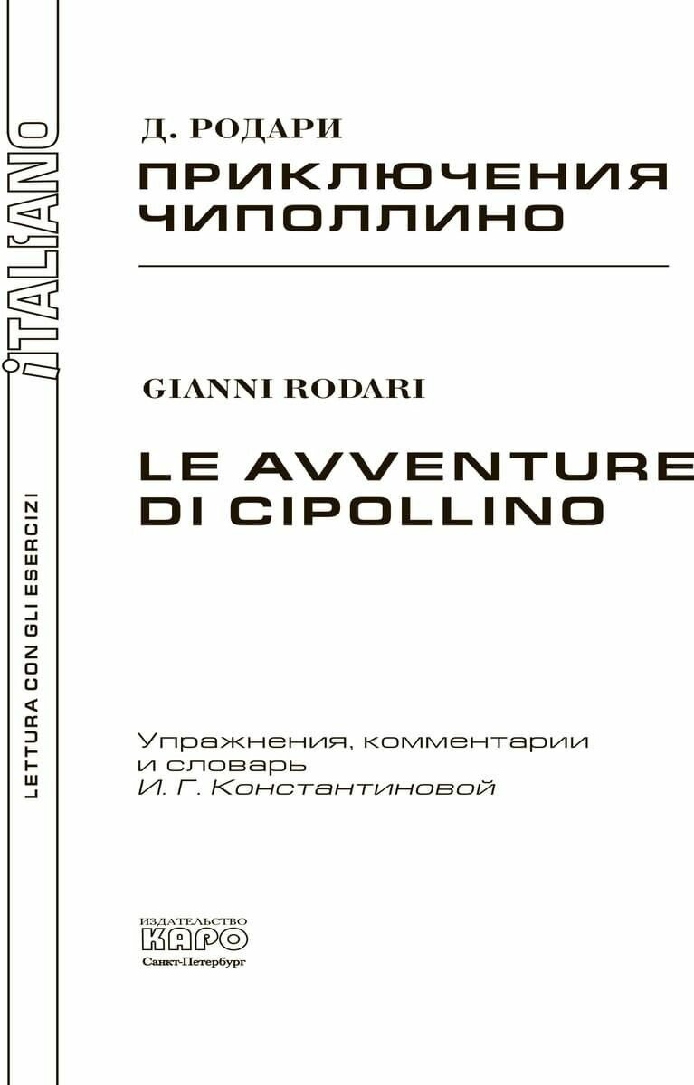 Замечательнейшая книжка! Неадаптированный текст снабжён иллюстрациями. В конце каждой главы есть задания на повторение, составленные почётным переводчиком итальянского языка Константиновой. Она же написала сноски и составила словарь в конце книги.