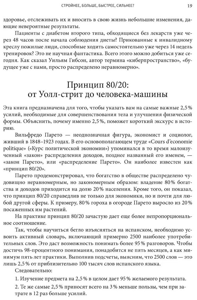 Это не просто очередная книга о диетах и фитнесе. Это книга о том, как преобразить себя и свое тело — быстро и легко, с минимальными затратами сил и времени, следуя простым методикам, которые автор испытывал на себе на протяжении более десяти лет. Вы узнаете о том, как: - сбросить более 45 кг, тратя всего 20 минут дважды в неделю; - спать по 2 часа в день и чувствовать себя хорошо отдохнувшим; - переедая, сбросить больше жира, чем теряет на дистанции бегун-марафонец; - набрать более 15 кг нежировой мышечной массы без стероидов, проведя в тренажерном зале в общей сложности 4 часа; - сбросить 10 кг веса за 30 дней без специальных тренировок; - пробежать 50 км после всего лишь 12 недель тренировок; - и многое, многое другое. Эти методики были получены в результате тысяч экспериментов, в которых лично участвовал автор книги. Тим Феррис проверял все эти методики на себе — в спортивном зале и в спальне, на стадионах и в ресторанах, в центрах подготовки спортсменов-олимпийцев и научных лабораториях, работая с всемирно известными диетологами, врачами, тренерами, спортсменами, физиологами, химиками и сексологами; среди его учителей были наставники олимпийских чемпионов, специалисты из индустрии развлечений для взрослых и даже бывший инструктор советского спецназа. В книге содержится коллективная мудрость сотен выдающихся спортсменов и десятков докторов наук, а также десятки историй успеха обычных людей, мужчин и женщин в возрасте от 18 до 70 лет, добившихся потрясающих результатов с использованием предлагаемых автором методик.