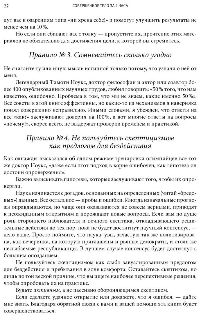 Автор не упускает возможности подчеркнуть, что вы вот-вот узнаете супер-секретные методы, которые идут вразрез со всем общепринятым, однако дают фантастические результаты в кратчайшие сроки. Я пока прочитал общие главы (их Феррис рекомендует изучить в обязательном порядке) и начал осваивать материалы о наборе мышечной массы.