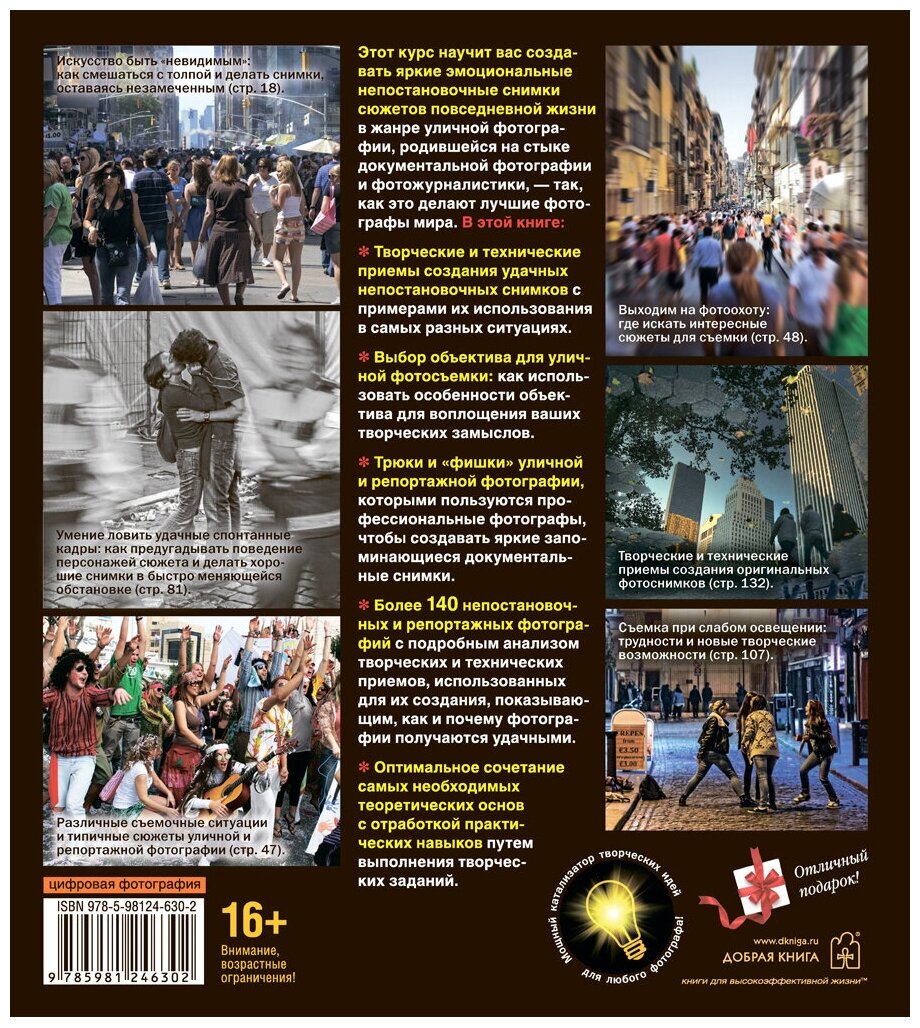 Этот курс научит вас создавать яркие эмоциональные непостановочные снимки сюжетов повседневной жизни в жанре уличной фотографии, родившейся на стыке документальной фотографии и фотожурналистики, - так, как это делают лучшие фотографы мира. В этой книге: