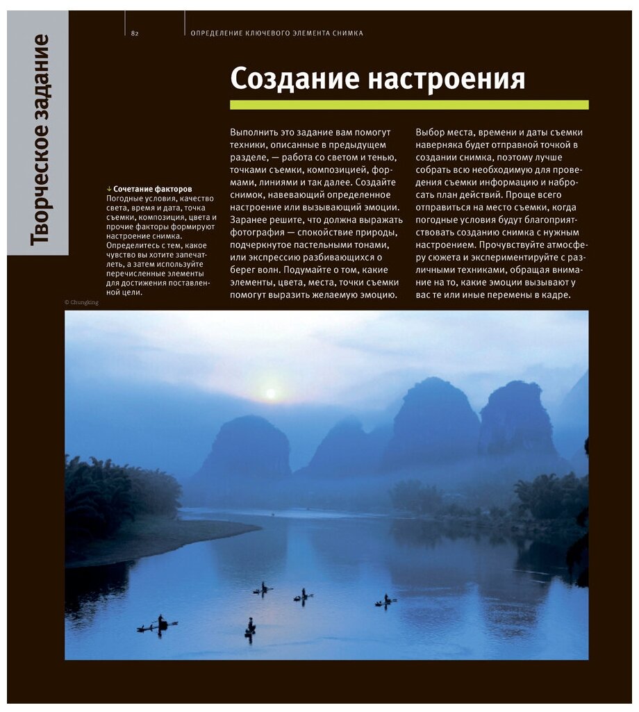Большее внимание уделяется не техническим аспектам пейзажной фотосъемки, а все-таки композиционным. Основная мысль, проходящая через всю книгу - думайте, что и как будете снимать заранее: приходите на место заблаговременно, несколько раз, думайте про погоду, освещение в разное время суток...