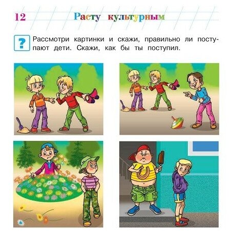 Обычно большинство книг из серий для развития дошкольников дают знания о математике, чтении и окружающем мире. Неожиданно приятно было среди них наткнуться на книгу "Расту культурным". С удовольствием сама её просмотрела: здесь и правила дружбы, уроки этикета (даже целое занятие посвящено столовым приборам!), правила поведения в метро, театре, музее, магазине, также ребёнок узнает как правильно обращаться с книгой и игрушками. В пособии найдутся и сказки, и стихи, и интересные рисунки, и творческие задания. Книгу я приобрела недавно (вернее, весь комплект "Ломоносовской школы" для 4-5 лет), сын только-только начал её осваивать. Остановила свой выбор именно на этой серии ориентируясь по отзывам родителей. Надпись на обложке "Для одаренных детей" сначала показалась мне рекламным ходом, но, просмотрев все книги серии, могу сказать, что они вполне годятся и для шестилеток и полностью подготавливают малышей к школе. Что за знания даются в "5-6 лет" и тем более в "6-7 лет" - даже не представляю. Единственным, но не критичным недостатком считаю слишком простые иллюстрации, многие из которых повторяются из книги в книгу (например, изображение ежа, яблока и тд). Качество печати и бумага для своей цены отличные. Жаль, что нельзя писать много рецензий - хотелось бы рассказать о всех книгах серии. Маленький совет от меня: если ваш 5-6-летний ребёнок ранее не изучал буквы, можете начать с книги "Знакомлюсь с буквами" для 3-4 лет из этой же серии.