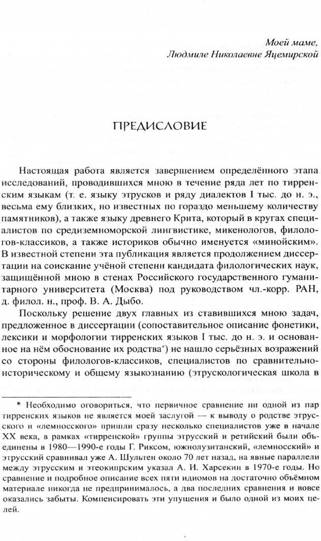 Предлагаемая читателю работа в известной степени является продолжением кандидатской диссертации, посвященной тирренским языкам (этрусскому и близким ему малоизвестным диалектам I тысячелетия до н.э.), а также включает описание минойского языка (т.е. языка древнейшего населения Крита), в соответствии с предложенной автором гипотезой о генетическом родстве этих идиомов. Помимо сравнительного описания собственно языковых реалий (фонетики, морфологии, словообразования) она содержит необходимые экстралингвистические сведения - информацию о народах-носителях этих языков, характеристику письменных памятников и других источников, ряда собственно письменностей, а также описание некоторых методов дешифровки и комбинаторного анализа. Монография призвана восполнить возникший не только в отечественной, но и в мировой науке пробел в сравнительном исследовании всех перечисленных языков.