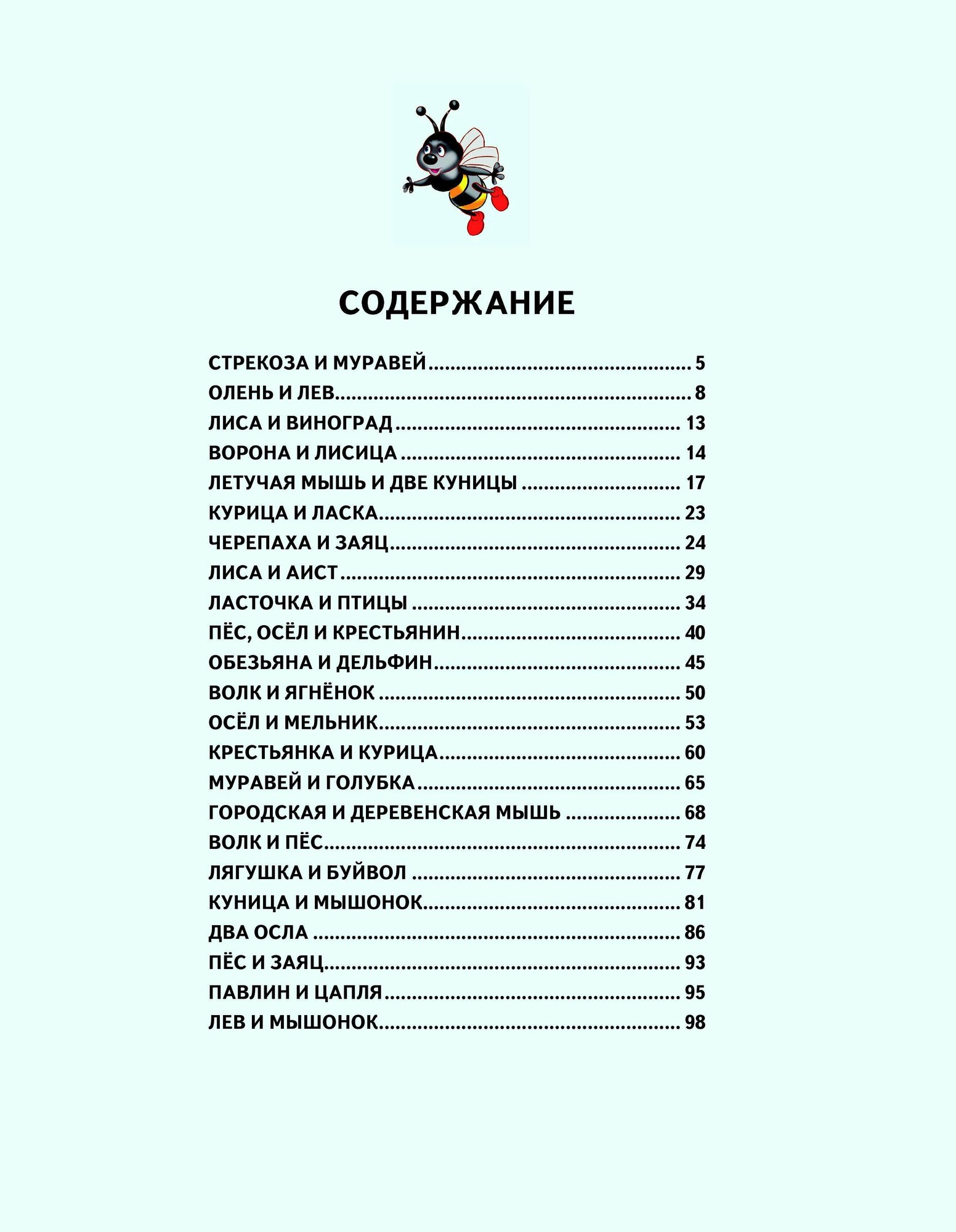 В сборник вошло 23 произведения: «Стрекоза и муравей», «Черепаха и заяц», «Крестьянка и курица», «Волк и пёс» и многие другие.