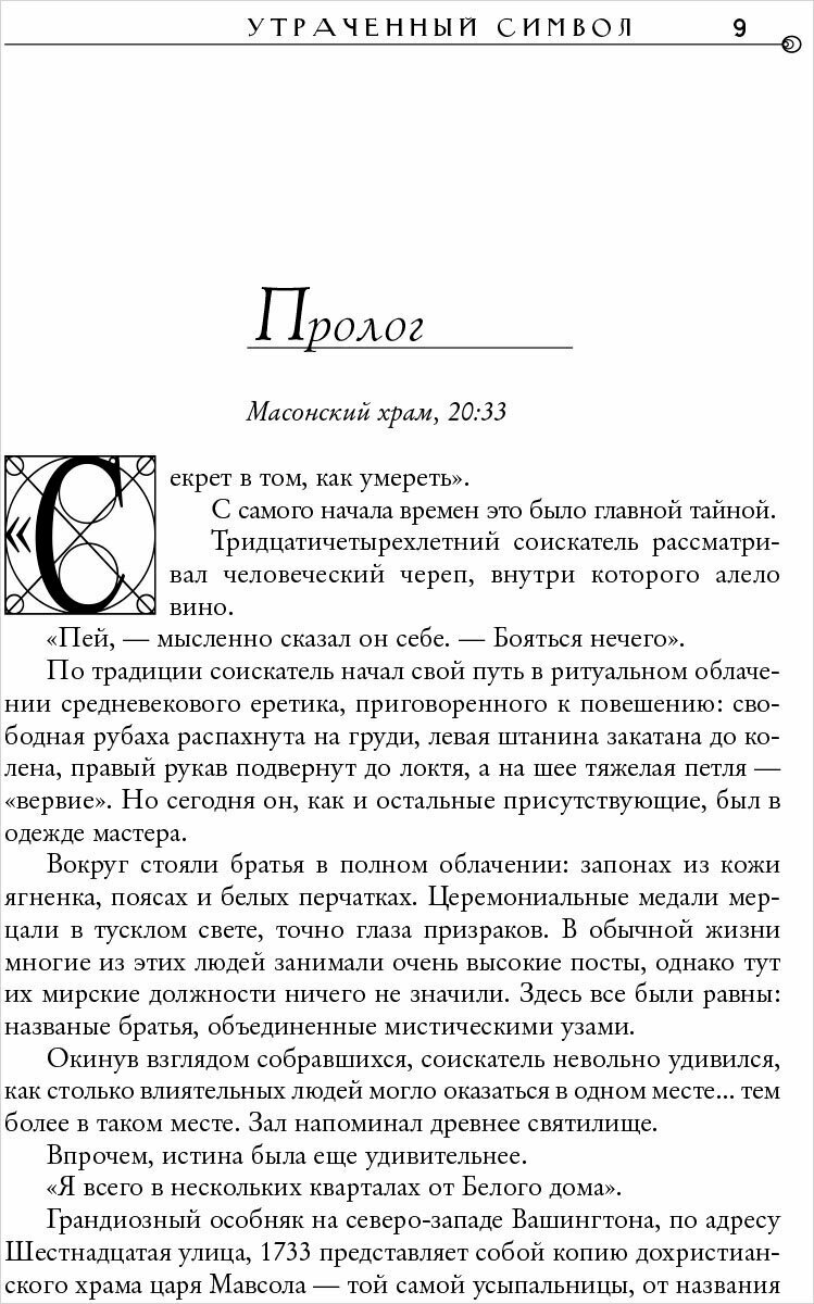 "Утраченный символ" мне понравился меньше, чем "Код да Винчи" и "Ангелы и демоны". Вроде бы использованы те же захватывающие приемы в виде динамичного сюжета, многоступенчатых тайн и загадок, детективной интриги, описания культурных и исторических ценностей Вашингтона, однако развязка, на мой взгляд, получилась слабоватая. Последние 50 страниц дочитывала с трудом, из-за этого впечатление от всей книги смазалось, хотя в ней было немало любопытных задумок.