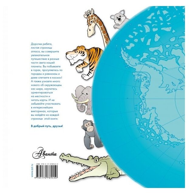 Листая страницы атласа, вы совершите увлекательное путешествие в разные части света нашей планеты. Вы побываете в горах, прогуляетесь по городам и равнинам и даже слетаете в космос! А также узнаете много нового об окружающем нас мире, научитесь ориентироваться на местности и читать карты. И не забывайте участвовать в интереснейших викторинах, которые вы найдете на каждой странице этой книги.
