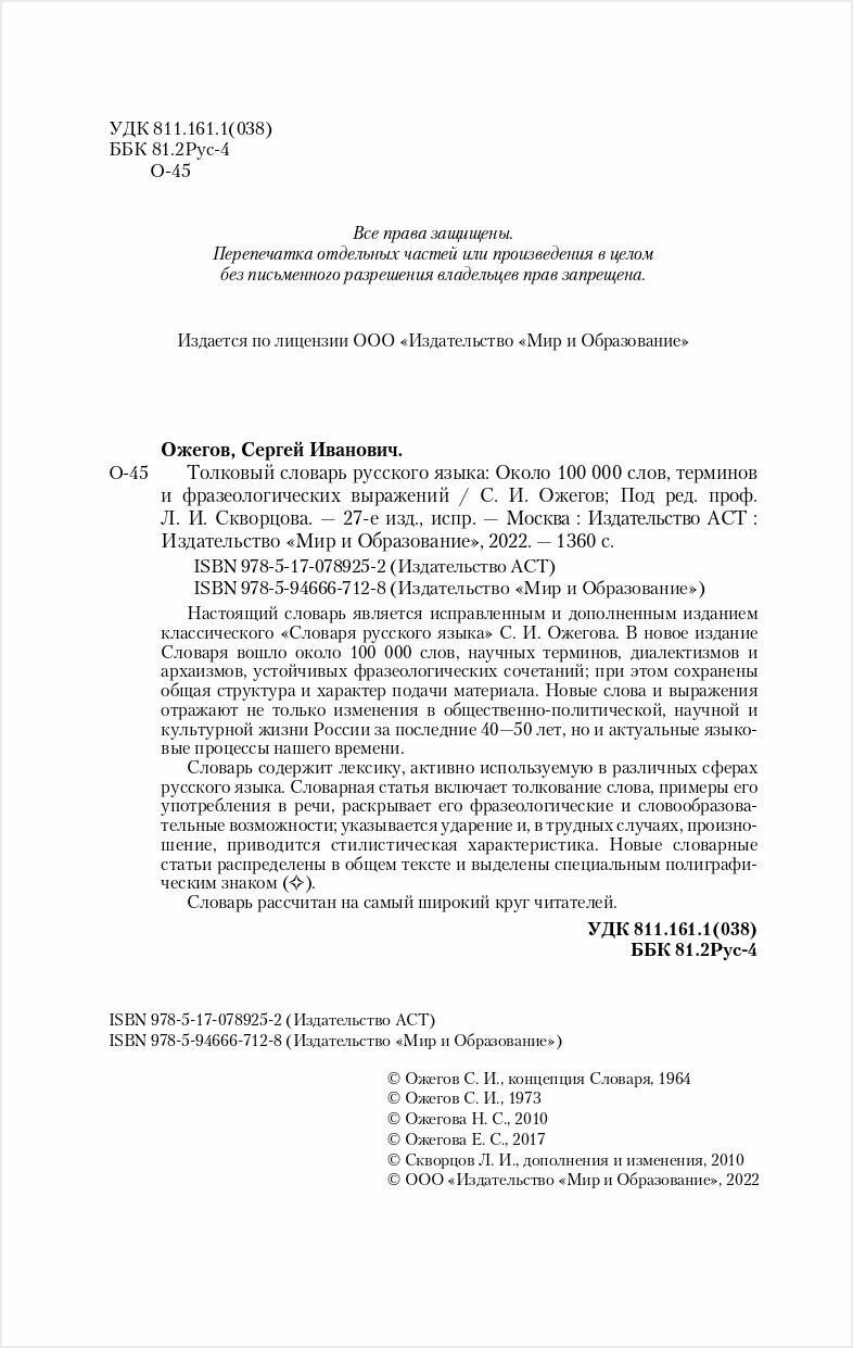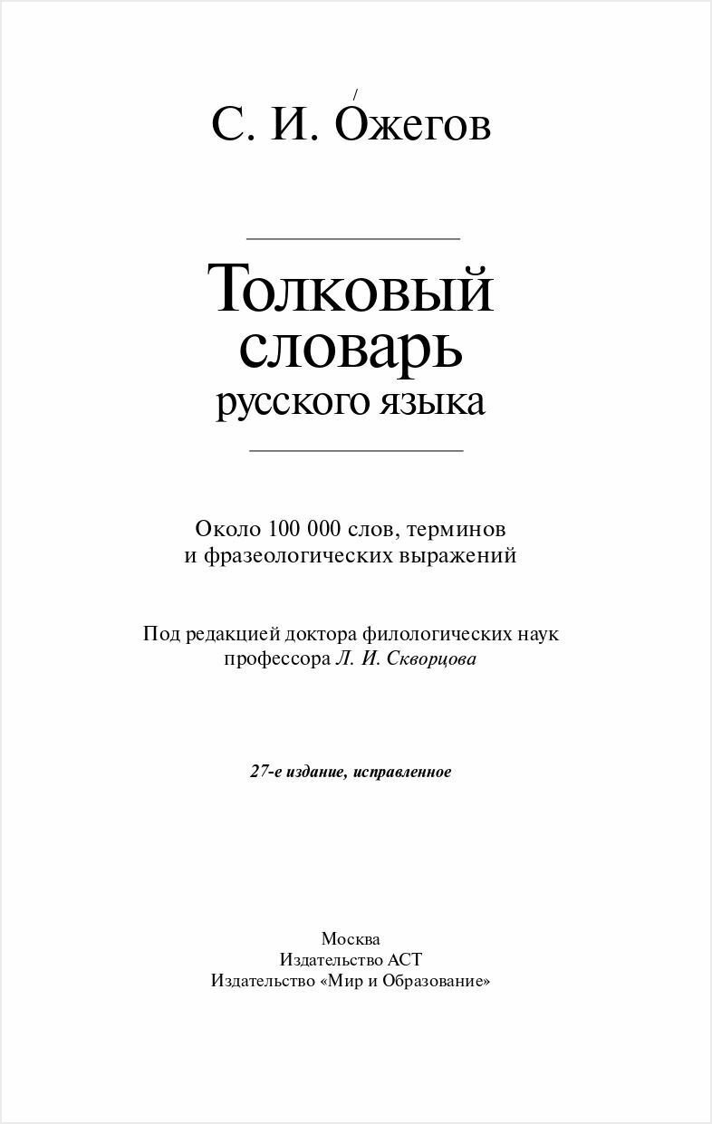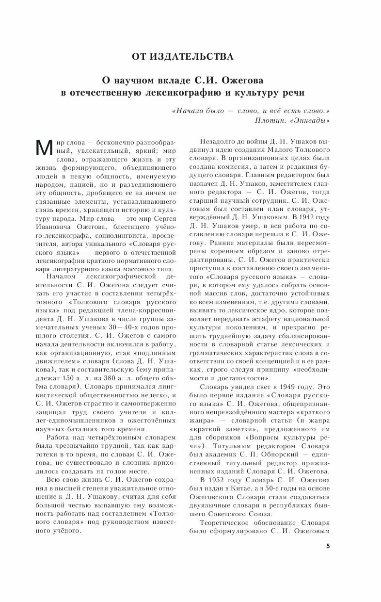Настоящий словарь является исправленным и дополненным изданием классического "Словаря русского языка" С. И. Ожегова. В новое издание Словаря вошло около 100 000 слов, научных терминов, диалектизмов и архаизмов, устойчивых фразеологических сочетаний; при этом сохранены общая структура и характер подачи материала. Новые слова и выражения отражают не только изменения в общественно-политической, научной и культурной жизни России за последние 40-50 лет, но и актуальные языковые процессы нашего времени.