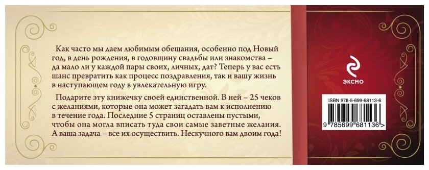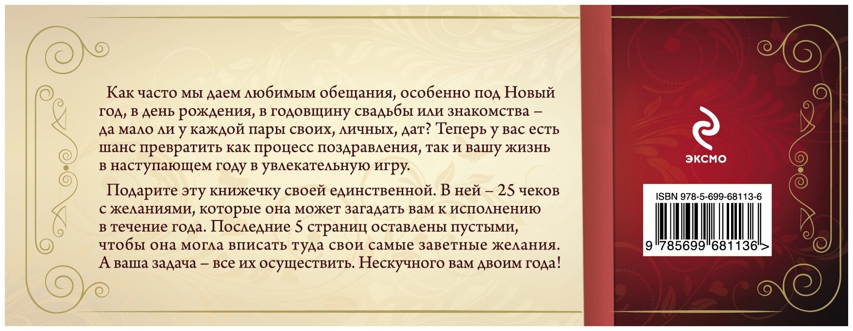Подарите эту книжечку своей единственной. В ней - 25 чеков с желаниями, которые она может загадать вам к исполнению в течение года. Последние 5 страниц оставлены пустыми, чтобы она могла вписать туда свои самые заветные желания. А ваша задача - все их осуществить. Нескучного вам двоим года!