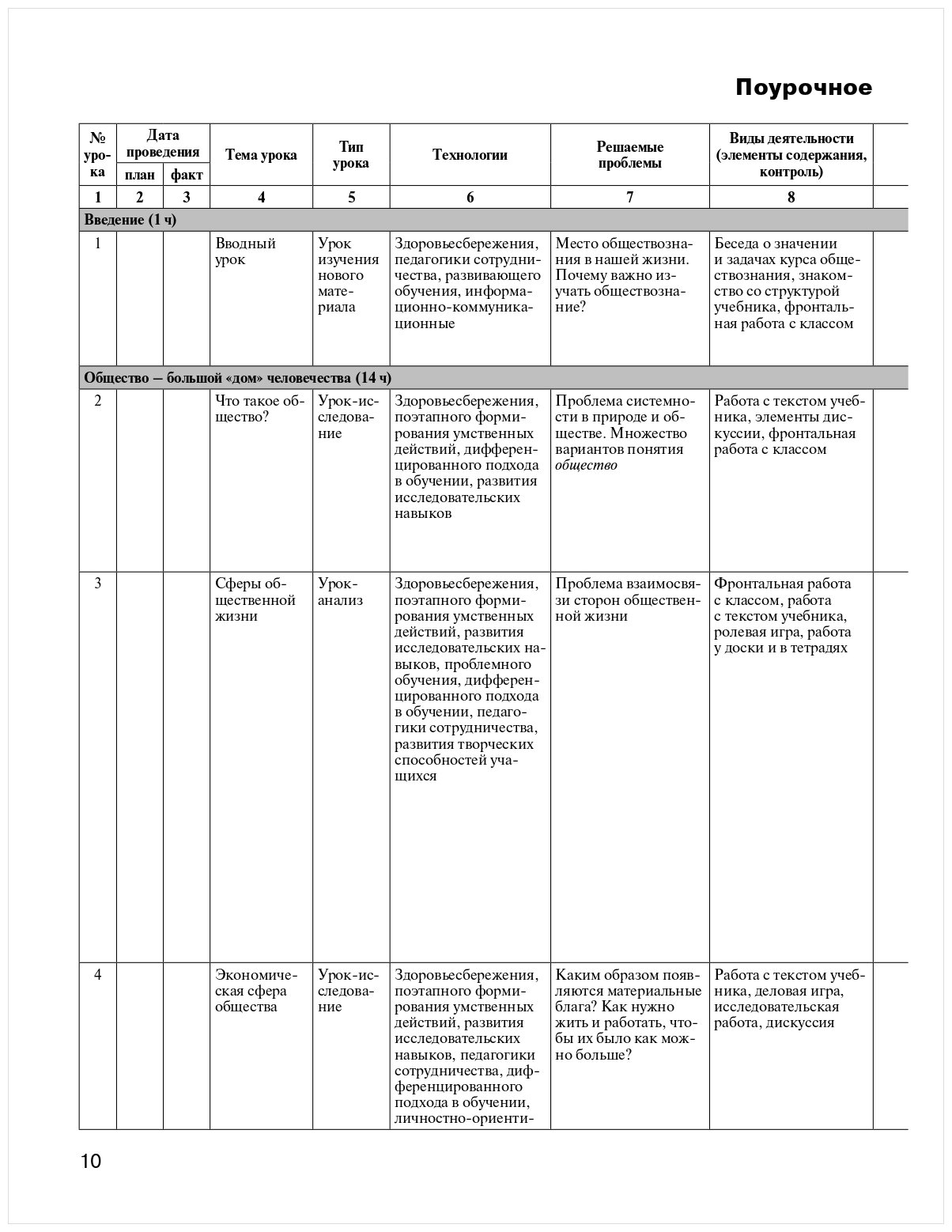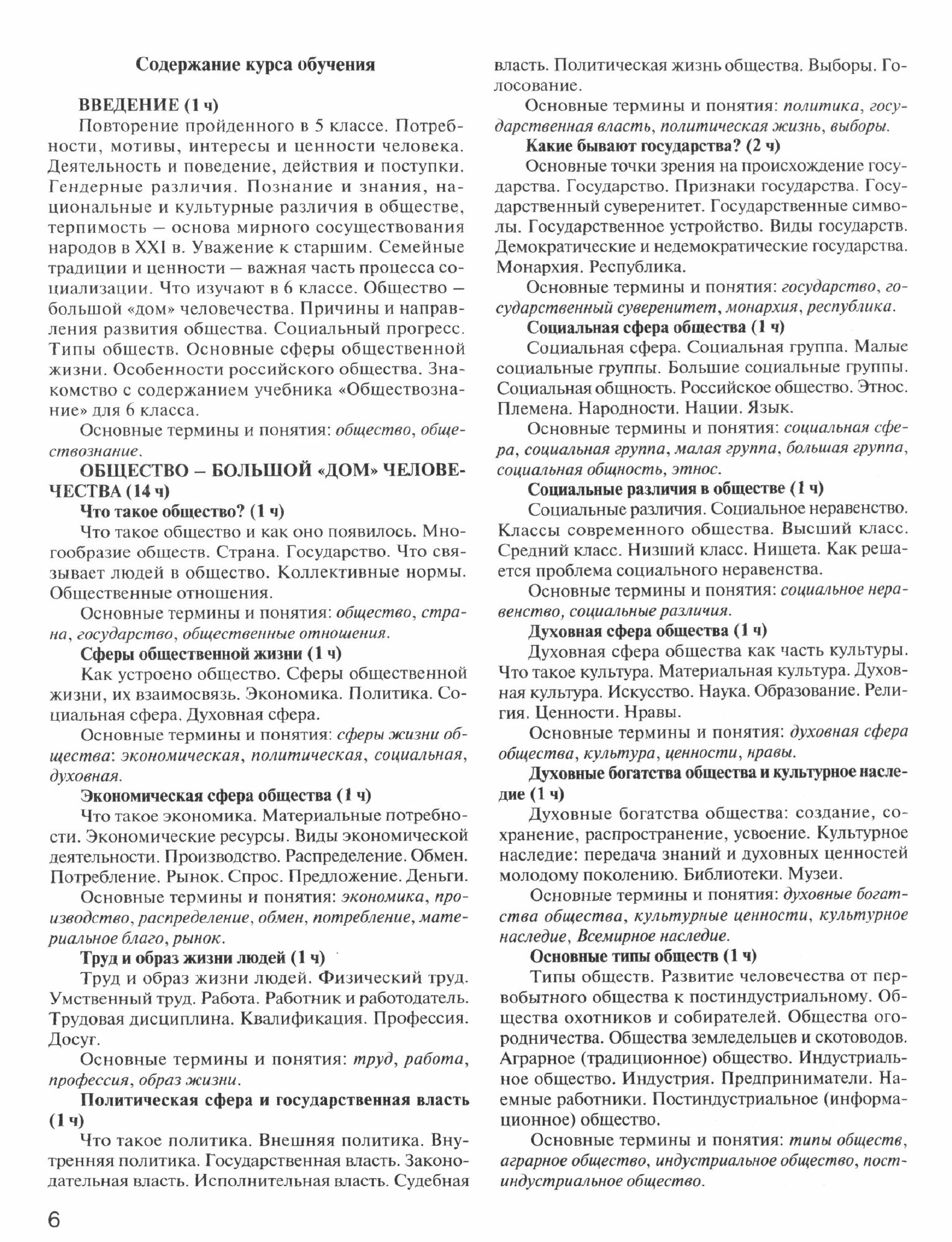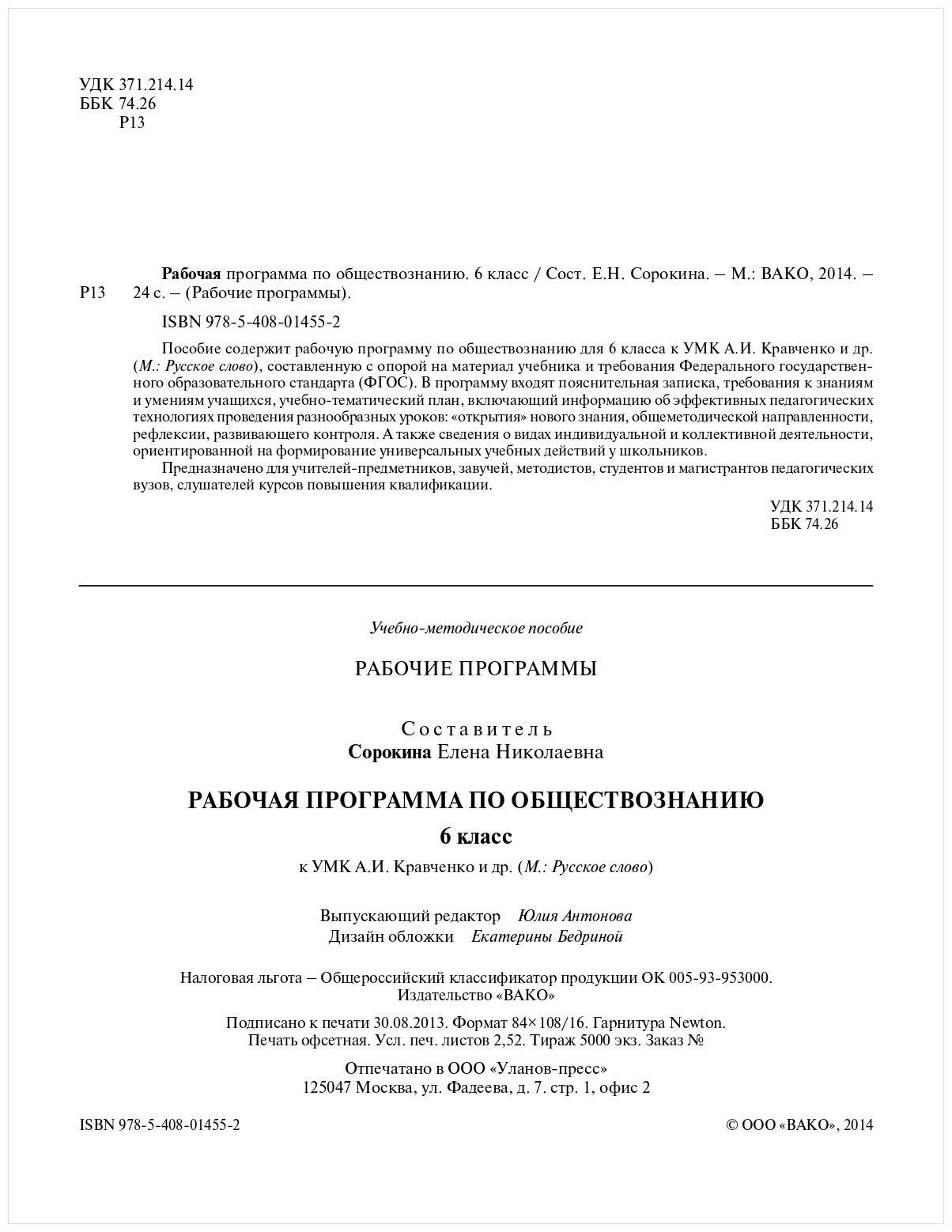 Пособие содержит рабочую программу по обществознанию для 6 класса к УМК А.И. Кравченко и др. (М.: Русское слово), составленную с опорой на материал учебника и требования Федерального государственного образовательного стандарта (ФГОС). В программу входят пояснительная записка, требования к знаниям и умениям учащихся, учебно-тематический план, включающий информацию об эффективных педагогических технологиях проведения разнообразных уроков: "открытия" нового знания, общеметодической направленности, рефлексии, развивающего контроля. А также сведения о видах индивидуальной и коллективной деятельности, ориентированной на формирование универсальных учебных действий у школьников.