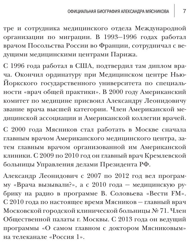 Это первая А.Мясникова которую я прочитал. Ранее я смотрел и слушал передачи с его участием. Александр симпатичен мне и как врач, и как просто человек. Формат книги удобен тем что быстро можно найти фрагмент который важен для тебя именно сейчас. Большое спасибо автору и издательству за такую книгу.