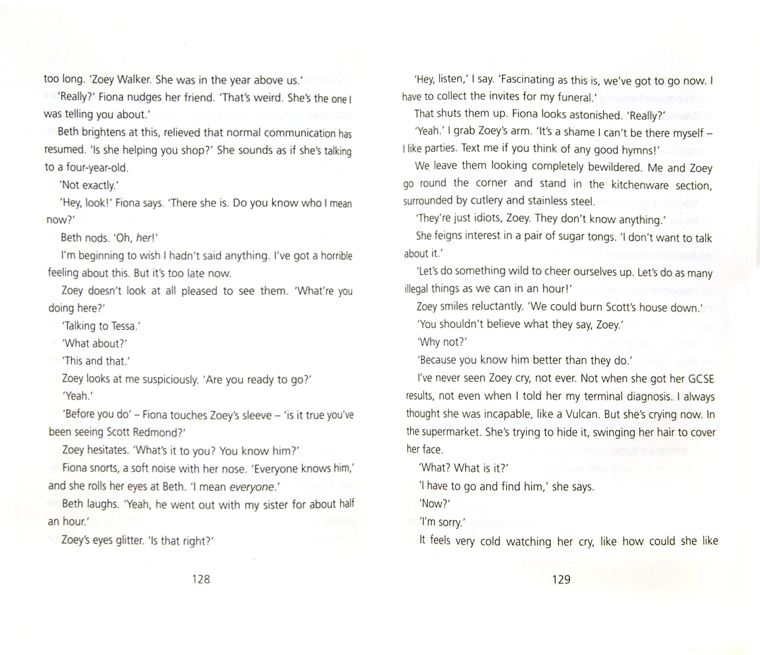 Tessa has just a few months to live. Fighting back against hospital visits, endless tests and drugs with excruciating side-effects, Tessa compiles a list. It's her Before I Die list. And number one is sex. Starting tonight. Released from the constraints of 'normal' life, Tessa tastes new experiences to make her feel alive while her failing body struggles to keep up. Her feelings, her relationships with her father and brother, her estranged mother, her best friend, and the powerful, bittersweet first love she finds with the boy next door - all are painfully yet beautifully crystallized in the precious weeks before Tessa's time finally runs out.