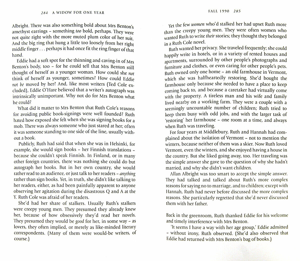 This is the story of Ruth Cole. It is told in three parts: on Long Island, in the summer of 1958, when she is only four; in 1990, when she is an unmarried woman whose personal life is not nearly as successful as her literary career; and in the autumn of 1995, when Ruth Cole is a forty-one-year-old widow and mother. She's also about to fall in love for the first time...