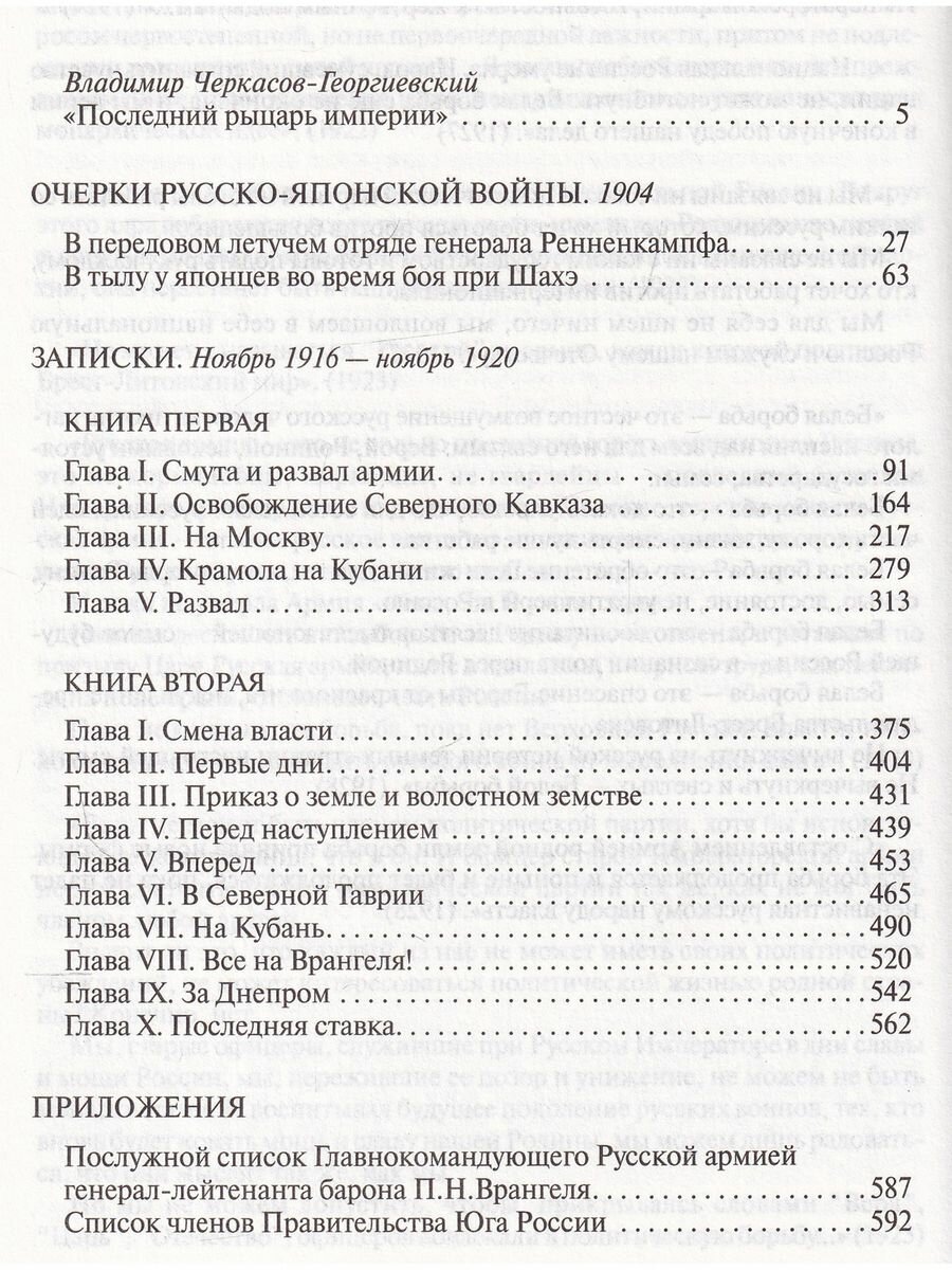 В книгу мемуаров генерала П.Н.Врангеля вошли его очерки о русско-японской войне, избранные фрагменты знаменитых "Записок", созданных в эмиграции и относящихся к периоду Первой мировой и Гражданской войн, его "Послужной список", выдержки из писем, посвященных истории создания "Записок", а также изречения Главнокомандующего, где в свойственной ему афористичной манере он изложил свои взгляды на политику, военное дело, эмиграцию и судьбу России.