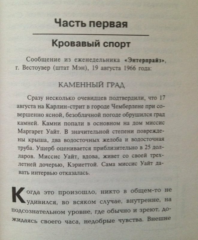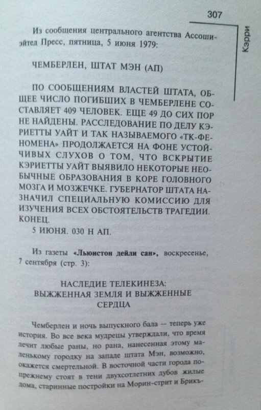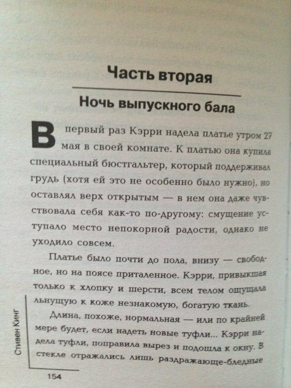 супер!!!!!это наверная единственная книга кинга,которую я прочитала до конца.мне очень понравилась книга.интересный сюжет с налетом мистики.после прочтении книги захотелось посмотреть фильм.старая версия фильм 1977 года намного интресней,чем новая вышедшия в этом году под названием теликинез.но книга все равно круче!!!!!!!