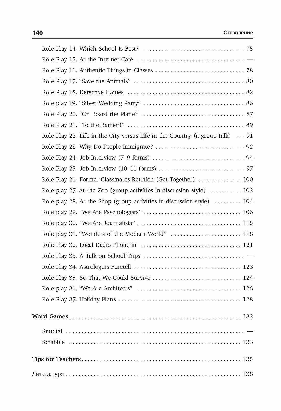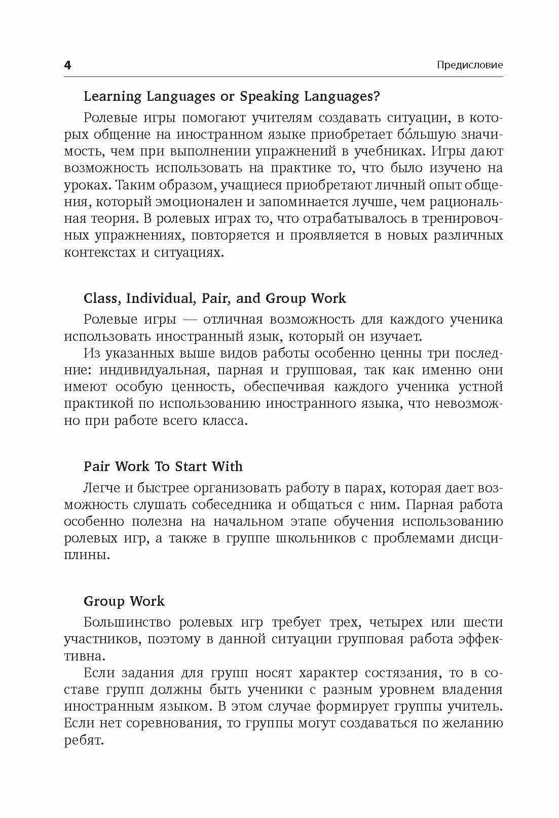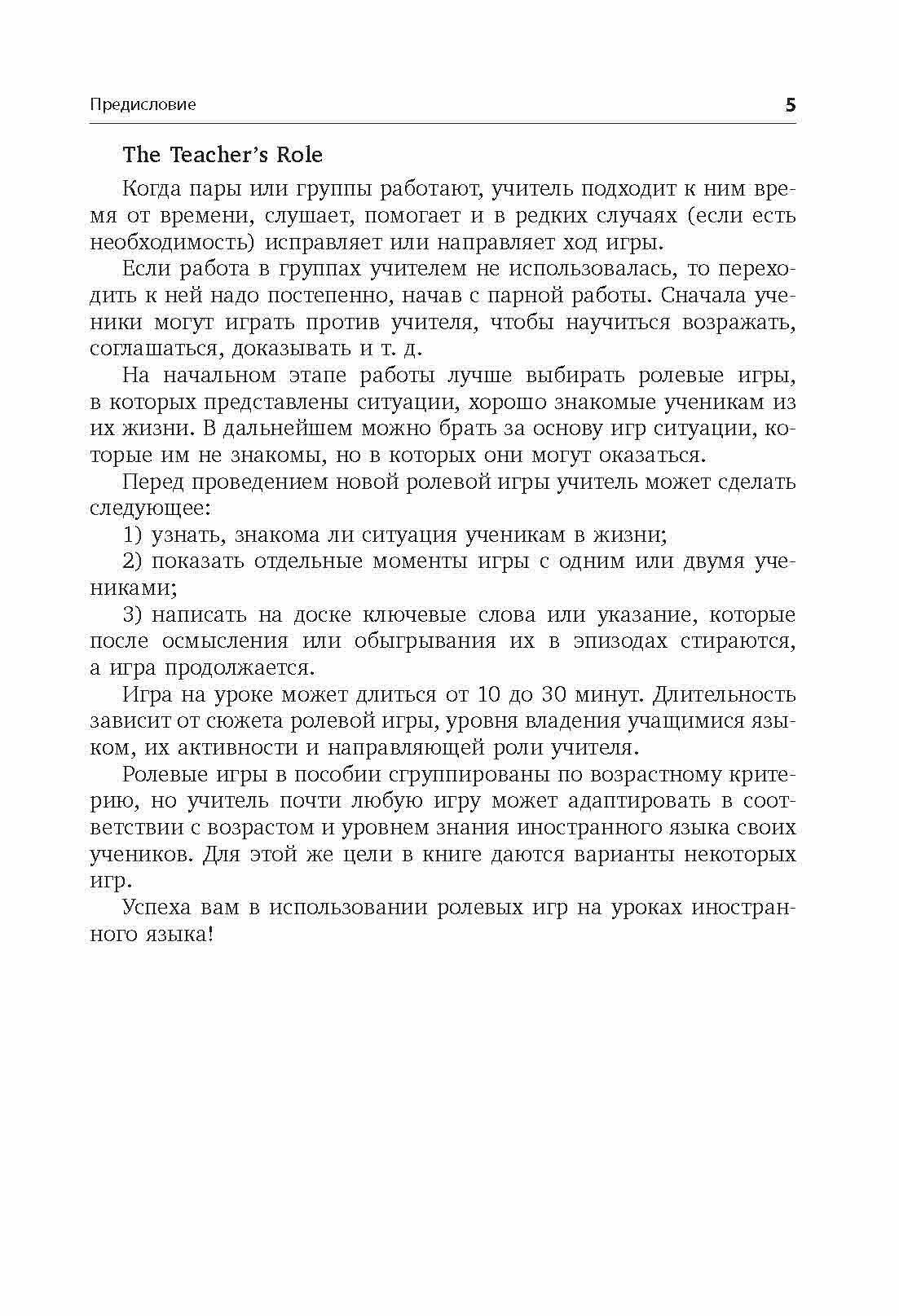 В издании два раздела: первый включает в себя игры для детей младшего возраста, второй - ролевые игры для учащихся среднего и старшего возраста. Участие в ролевых играх на уроках иностранного языка поможет учащимся на практике отработать изученный материал и развить коммуникативные навыки: задавать интересные вопросы, отвечать на них развернуто и аргументировано. Методические рекомендации к играм, несомненно, помогут педагогу подготовить необходимый материал к уроку и провести занятие в группе. Большинство игр представлены в нескольких вариантах и легко адаптируются в соответствии с возрастом и интересами учащихся.