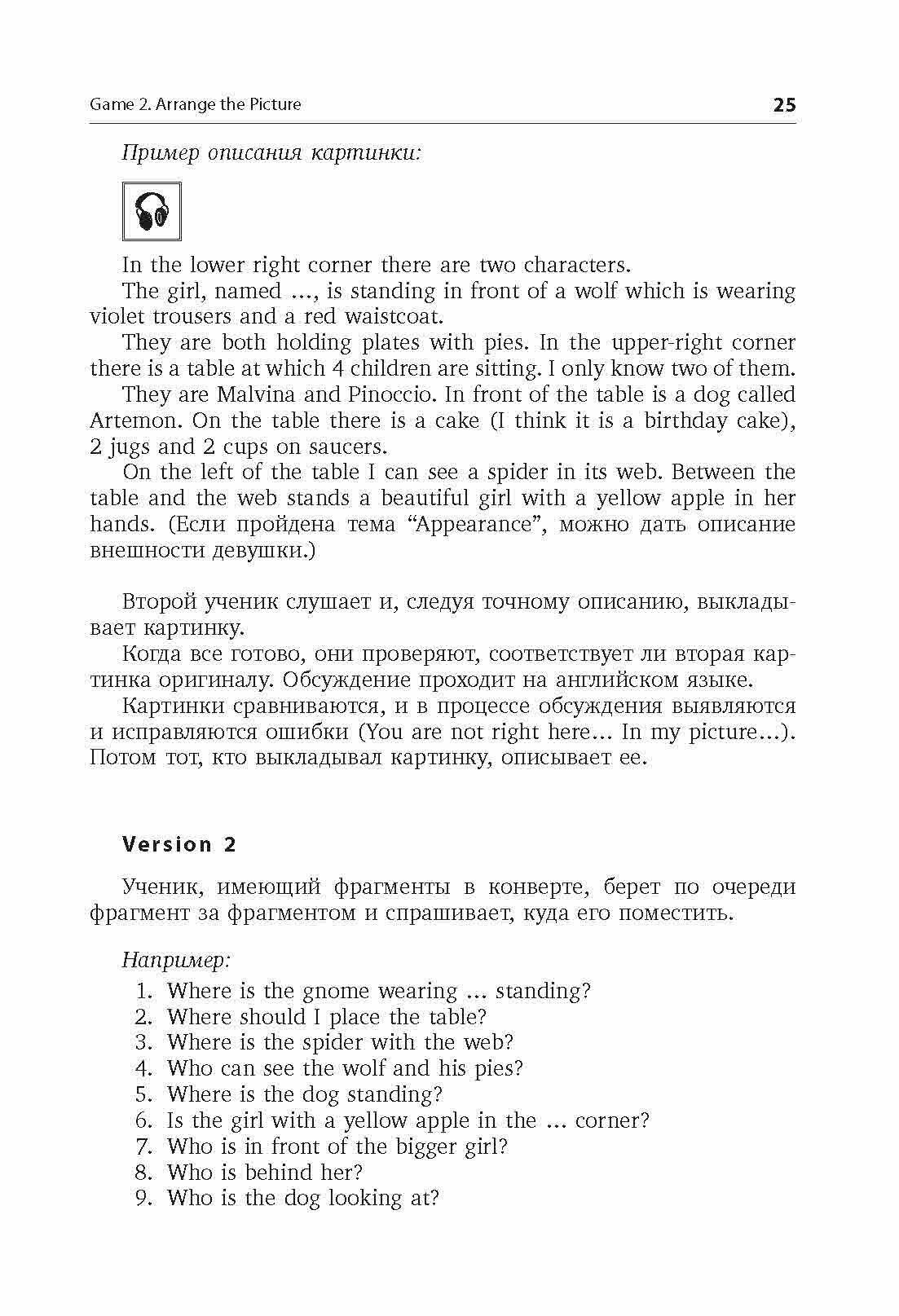 Тексты некоторых игр (описания картинок, ролевые карточки и т. п.) записаны на компакт-диск. Педагог может использовать запись по своему усмотрению: для прослушивания в классе со всей группой в качестве примера во время обучения ролевым играм, а также вместо чтения ролевой карточки, что сделает выполнение задания более полезным. Диск в комплект не входит.