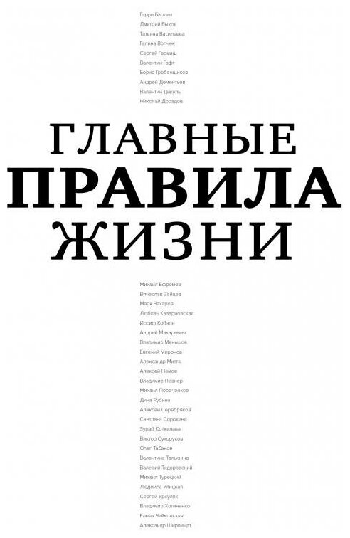 В этой книге собраны правила жизни наших выдающихся современников - Владимира Познера, Людмилы Улицкой, Дины Рубиной, Александра Ширвиндта, Валентина Гафта, Марка Захарова, Олега Табакова, Николая Дроздова и немногих других, чьи имена известны каждому в нашей стране. Мудрые, неожиданные, порой противоречивые - они заставляют задуматься о смысле жизни, о том, что такое счастье, любовь, успех; сверить свою житейскую философию с взглядами тех, кто достиг серьезных высот и, возможно, сформулировать для себя новые правила, по которым стоит жить.