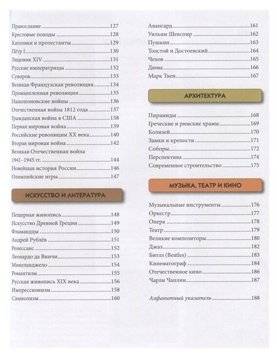 По размерам не могу сказать, что слишком большая – 192 страницы. В энциклопедии всего 11 больших глав и алфавитный указатель в конце. Информации по темам достаточно. Правда вот меня немного смутил указанный возраст 12+, ибо некоторые темы для такого возраста уже пройденный материал. Мне кажется, что такого рода энциклопедии больше подойдут для детей младшего школьного возраста, примерно от 6-7 лет. Собственно, моему сыну 7, в этом году пошли в первый класс, потому и решили приобрести какую-нибудь энциклопедию-помощник для учебы. И вот именно эта энциклопедия понравилась тем, что в ней разные темы из разных областей науки: тут и биология, тут и астрономия, история, анатомия и др. Да и качество у нее весьма приличное, уверена, что прослужит не один год. Однозначно советую эту энциклопедию к покупке