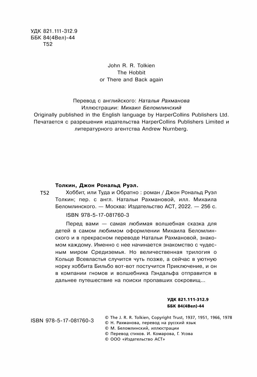 Для меня "Хоббит, или Туда и Обратно" с детства ассоциируется именно с иллюстрациями Михаила Беломлинского и переводом Рахмановой. До сих пор в книжном шкафу стоят 2! книги в коричневом твердом переплете, со слегка желтоватыми страницами. Сколько вечеров было проведено за этой книгой в детстве и сколько она раз была перечитана, несмотря на довольно мелкий шрифт - не описать. Спасибо АСТ за возможность вернуться в детство и за то,что позаботились о маленьких читателях, сделав шрифт более удобочитаемым! Иллюстрации выглядят тоже более четкими, так что с огромным удовольствием приобрела эту книгу для сына и теперь мы с ним вместе читаем - я книгу своего детства, а он новую - от АСТ.