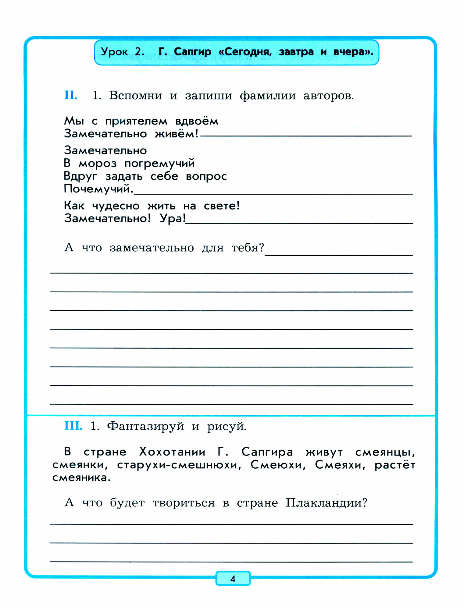 Как и в предыдущих тетрадях, в этой сохраняется деление заданий на этапы работы с текстом. Первая группа - это задания выполняемые до чтения, направленные на подготовку восприятия, постановку проблем и целей каждого урока. Вторая группа - задания, выполняемые в процессе чтения, позволяющие проникнуть в читаемый текст, проследить авторскую позицию, понять тему и идею читаемого произведения, а также его художественные особенности. Третья группа заданий - обобщающие и творческие - выполняются после прочтения произведения и позволяют детям высказать свою точку зрения на прочитанное, сделать выводы и проявить свои способности (например, нарисовать героя).