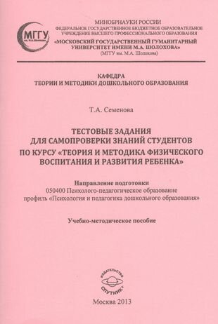 Учебно-методическое пособие предназначено для самопроверки знаний студентов по курсу "Теория и методика физического воспитания и развития ребенка". Цель предлагаемых тестовых заданий состоит в уточнении, конкретизации, систематизации и закреплении основных теоретических положений и практических навыков, полученных в ходе аудиторных и внеаудиторных занятий по данной дисциплине. Издание адресовано студентам, обучающимся по направлению подготовки 050400 Психолого-педагогическое образование: профиль "Психология и педагогика дошкольного образования", специалистам в области физического воспитания детей дошкольного возраста, преподавателям методики физического воспитания высших и средних специальных учебных заведений, магистрантам, аспирантам и всем, кого интересует данная проблема.
