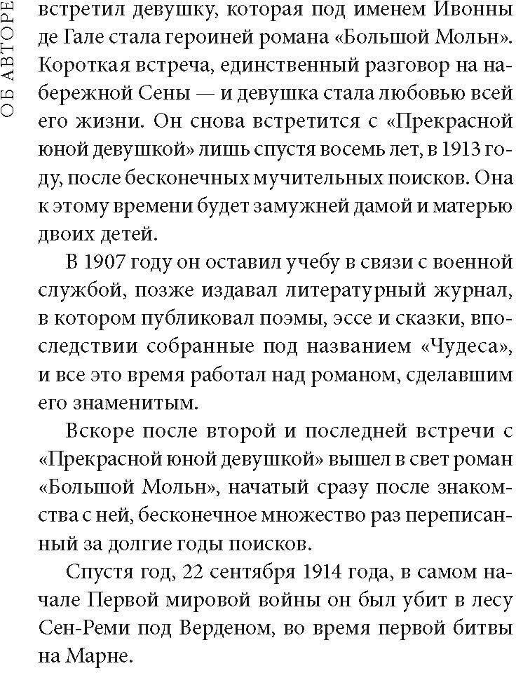 Анри Альбан Фурнье (1886-1914), писавший под псевдонимом Ален-Фурнье, получил мировую известность благодаря единственному завершенному роману "Большой Мольн", написанному в 1913 году, за год до гибели. Воспоминания автора о детских годах, о школе, об играх и думах подростков сочетаются с динамичным сюжетом и романтической интригой, с реалистическим изображением французской провинциальной жизни. В книге приводится полный неадаптированный текст романа с комментариями и словарем.