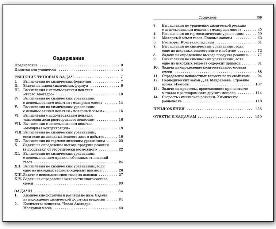 Хороший сборник для практики решения задач. Разбираются разные типы. Также много задач для самостоятельного решения. Есть ответы. Качество печати очень хорошее. Все слова четко видны. В конце есть приложение, в котором есть таблица растворимости, таблица с относительной молекулярной массой оксидов, кислот, оснований и солей, таблица с номенклатурами соединений. В приложении творцы науки рассказывется о ученых внесших вклад в развитие химии. Удивило и присутствие кроссворда. Думаю , что прослужит долго. Подойдет как и учителям, так и ученикам, которые решили заниматься химией самостоятельно.