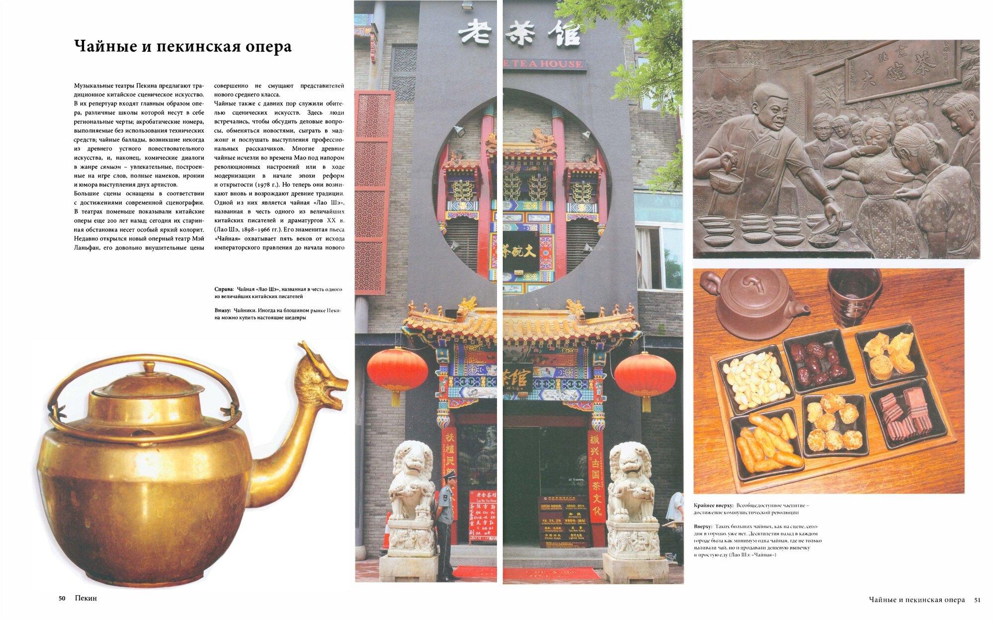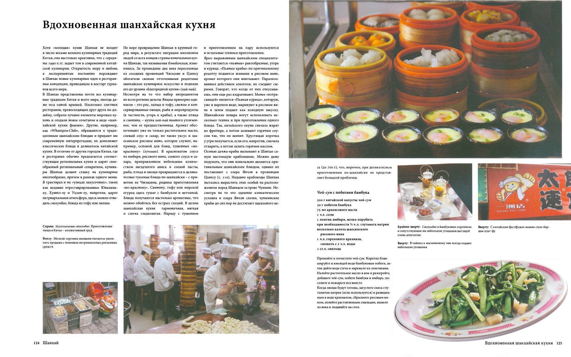 Очередной шедевр из серии Гастрономия. Громадный, толстенный, красивый том на мелованной бумаге и с массой фото. Перевод с немецкого, в самом начале имеется пояснение, что рецепты рассчитаны на 4 порции (чаще всего) и приведена система мер и весов. Ну а дальше - большая вводная и по регионам (Пекин и Шанхай выделены отдельно), в каждом подразделы (например, ночная жизнь в Хоухай, модной зоне отдыха в Пекине. статья по тексту и в целом по духу напоминает помесь статьи из "Вокруг света" и рекламного туристического буклета, из рецептов - упомянутые в тексте королевские креветки Пи-Па и свинина мушу, в тексте мною не найденная). В каждой главе есть подраздел по типу "кто ходит в гости по утрам" - "воскресный день в Циндао" (зарисовка из жизни чиновника и его жены - как ходили на рынок, как потом готовили и ели, на два разворота, текста мало, рецептов как таковых нет, лишь немного описан процесс приготовления, зато море фото "из семейного альбома" - "я с мужем и пакетом на фоне рынка", "ой, смотрите какой баклажан", "а вот это наша гостиная, классные у нас занавески?") "Один день шанхайского работника" (парень с папой, парень - гг, папа - для атмосфэры, текст вообще какой-то странный ("Дай Жэньцай не забывает о здоровье и регулярно покупает свежие овощи", "с некоторых пор в ходе популяризации здорового, экологически чистого питания..."), рецептов нет (ссылки на страницы), процесса приготовления нет (ибо сразу указано, что готовить не любят), фото еще круче (" я в семейниках читаю газету", "а у нас на кухне унитаз, ага", "и тут мы с папахеном дернули по пивку"). И вот эти врезки как-то дико раздражают, ибо от книги про гастрономию я жду собственно гастрономию, и если я хоть как-то готова найти её следы в статьях "Шаошань - память о Мао" (одной строкой упомянуто, что кормчий любил свиную грудинку "по-красному" - рядом рецепт) или "Буддизм китайского толка" (есть сноска про буддистскую кухню - про отказ от мяса, без рецептов) и даже в статье "Китайские застольные игры", то вот в таких гостеваниях или в статьях "культура хойчжоуских коммерсантов" и "Взгляд в будущее Шанхая" (обе - 100-процентно туристический буклет, из не самых лучших, кстати, ибо скучно) - гастрономии нет. Ваще. И вот это главный минус книги. Но плюсы перевешивают)))) Про чай и серебряные иглы, про свадебные рецепты и соусы, про бамбук и про то, как правильно резать продукты, про чайники и лапшу, "горлодер", супы и димсамы, чай пуэр и как покупать рис. Рецептов хотелось бы побольше, но с другой стороны, не стоит забывать - часть ингридиентов в России (центральной) труднодоступна. Ведь китайцы, как кстати, и вьетнамцы - везут к нам пошлые недорогие поделки, триады и дешевую рабочую силу. А вкусные аутентичные продукты, шелк и ррррроскошную (и оооочень недорогую) посуду blue&white - едут на Запад и в Штаты. так что те же соусы - фиг купишь. Итого - книга скорее культурологическая, я бы даже сказала гастространоведческая, для коллекционеров, в быту вряд ли применишь, да и готовить по тому, занимающему в развороте половину стола и дорогомуууу - не с руки.