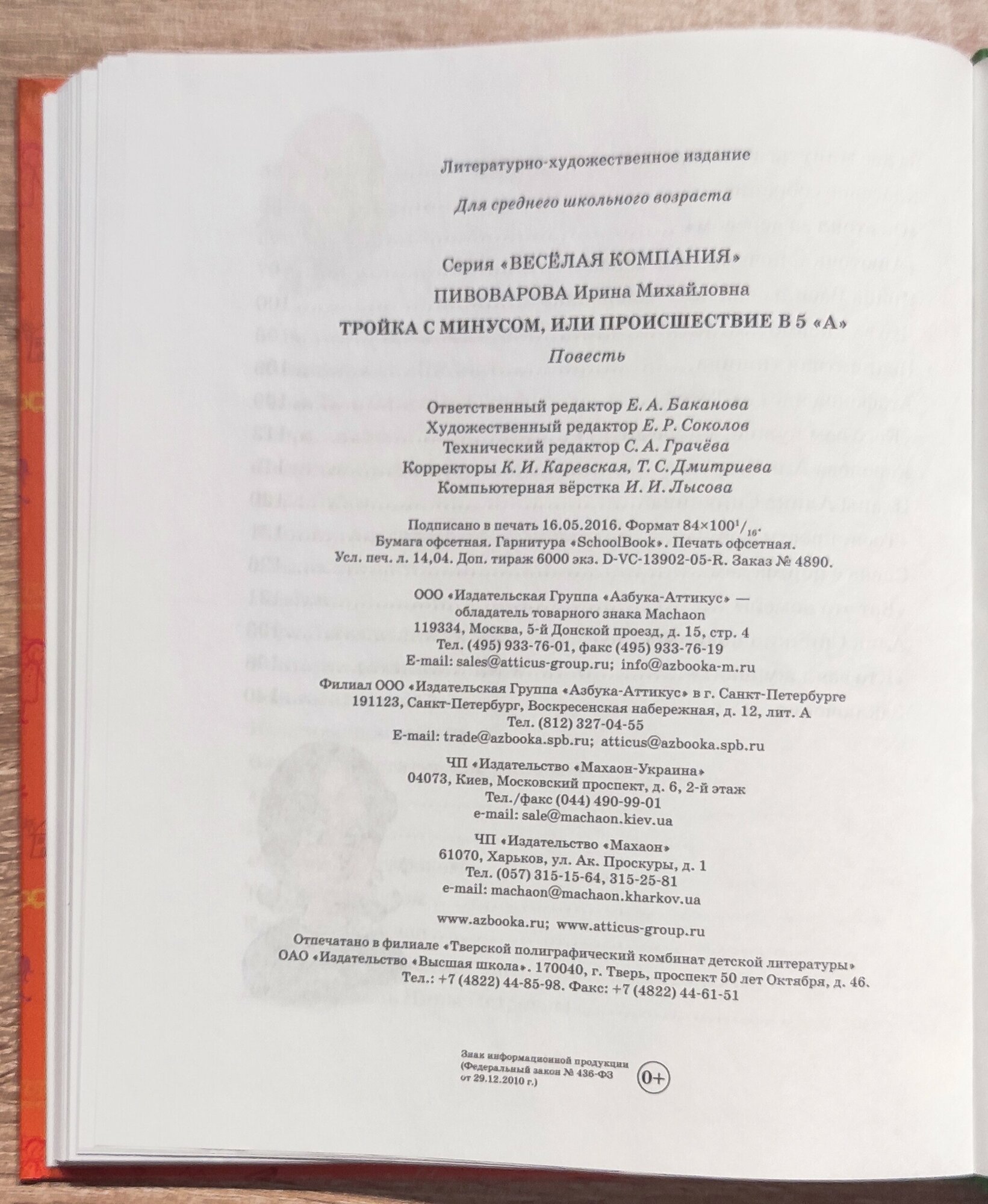 Это еще одна книга из серии Веселая компания в нашем доме. Очень хорошее качество исполнения книги. Также это не первая книга от Пивоваровой. Очень нравится сюжет и слог. Дочке 9 лет, сейчас предпочитает книги о школе.Читает сама, очень довольна.
