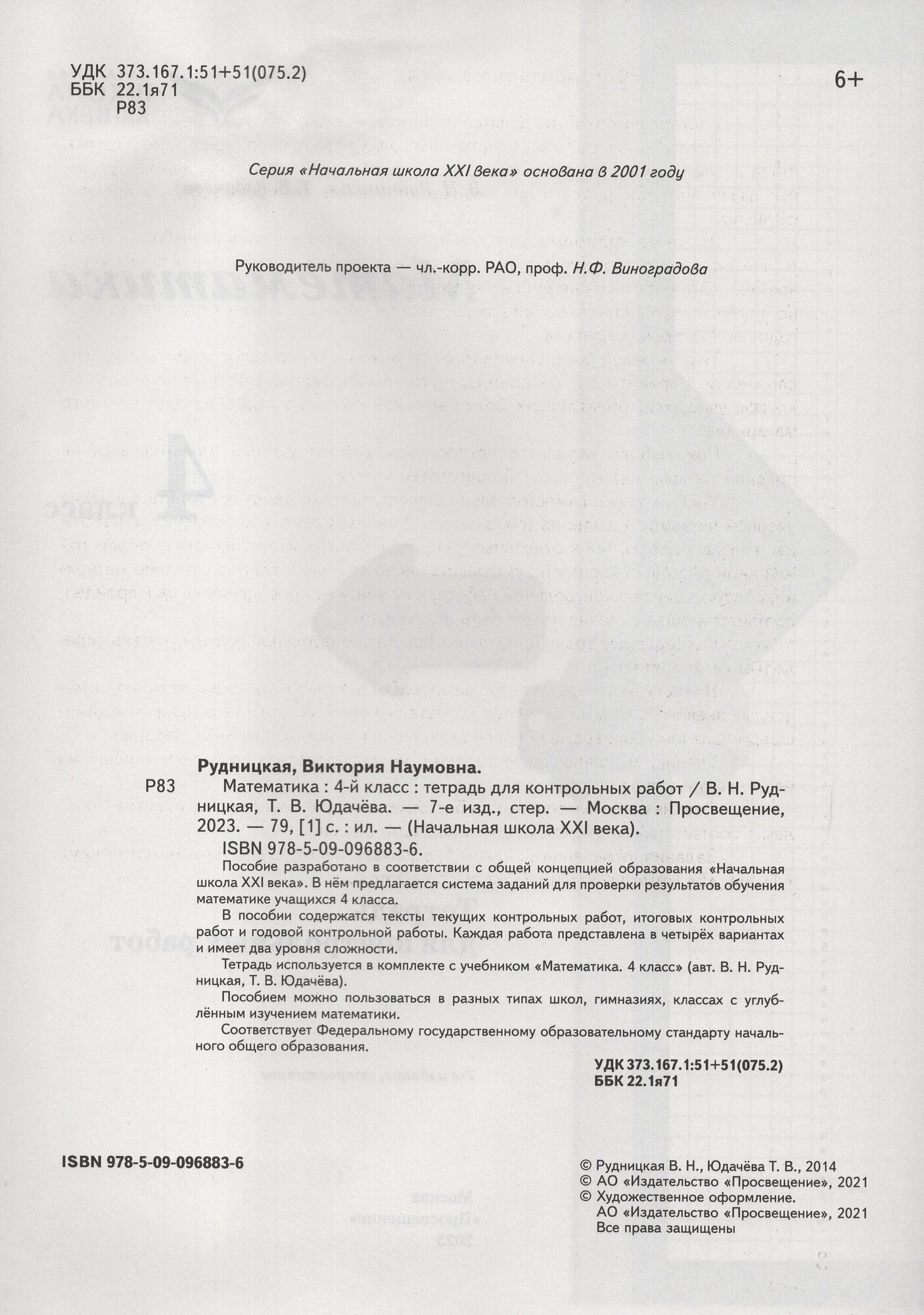 Математика. 4 класс. Тетрадь для контрольных работ. (Рудницкая Виктория Наумовна, Юдачева Татьяна Владимировна); Просвещение/Вентана-Граф, 2022