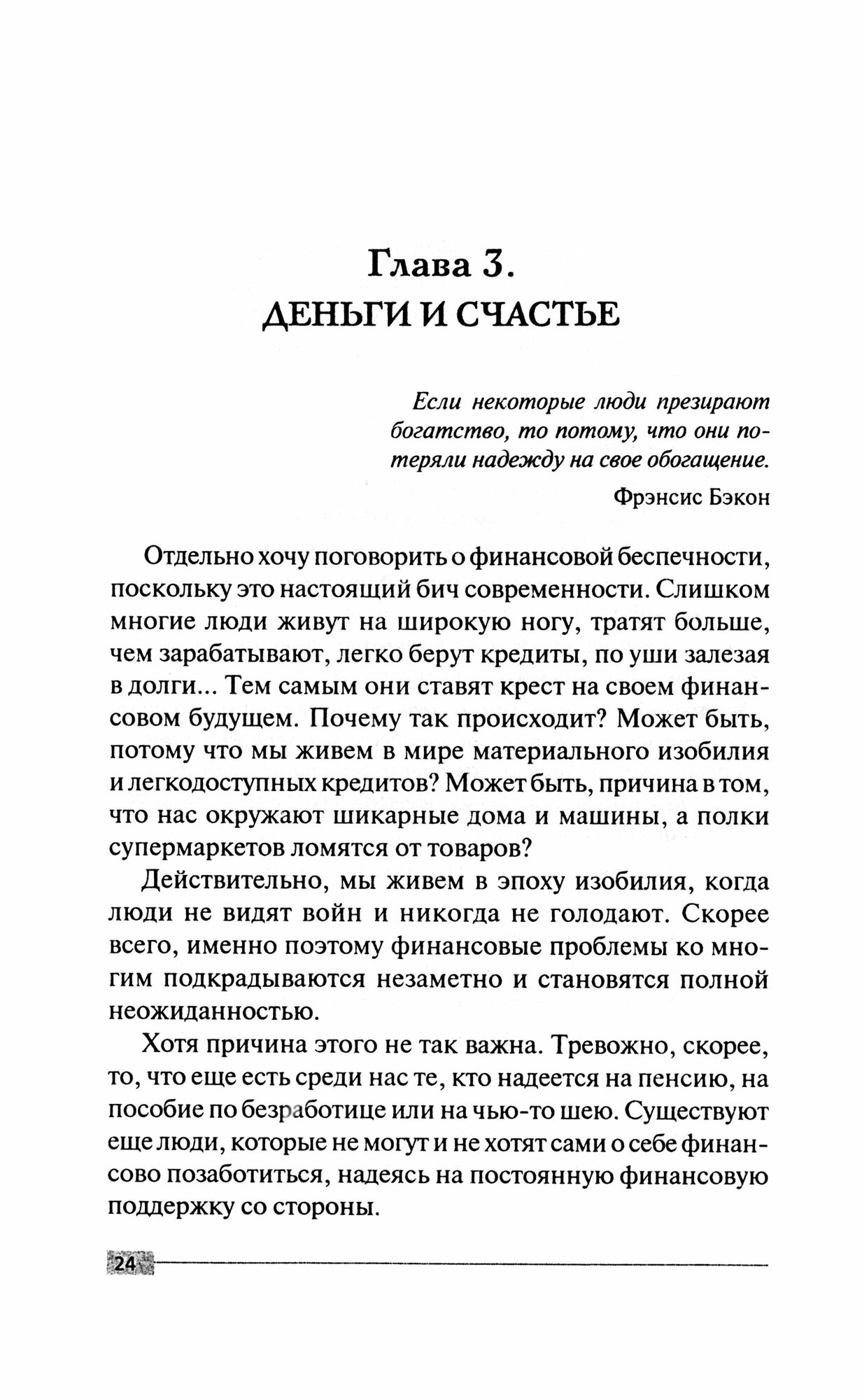 К сожалению это одна из самых бестолковых книг, которые есть в данной отрасли. Заголовок такой, лишь для того, чтобы автор ее продал, а по сути, прочитав ее, одна вода-водой. Из пары-тройки тезисов, автор раздул огромный талмут, где говорит об одном и том же, и это отнюдь не тема заголовка как могло бы показаться. Я хотела в этой книге найти для себя на пальцах рассказанные вещи об экономии и инвестировании, что такое представляет собой инфляция. А что я получила? Да, я увидела эти мысли на парочке страниц, но все остальное это вода о том как хорошо иметь связи (связи хорошо иметь, да! хорошо обрастать связями) и "не пора ли вам завести блог" (вот есть такая вещь как фейсбук, а еще ютуб, и все таки заведите блог, ну же!) Именно в таком ключе. Это зря потраченное время и деньги. Не буду читать этого автора и никому не советую.