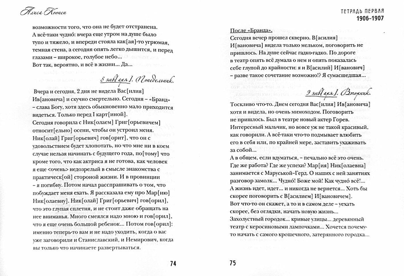 Дневник 1907-1913 годов. Ведёт его начинающая актриса МХТ, влюблённая в Качалова. История любви и ревности разворачивается при участии Немировича-Данченко, Скрябина, Берсенева, Германовой, Кореневой, Лилиной, а также Станиславского, выступающего в основном за кулисами сюжета, зато в амплуа "злодея". Сняв Коонен с роли Офелии, он ускорил её решение покинуть МХТ. В записях юной Алисы, ещё не встретившей Таирова, который станет её мужем и главным режиссёром её жизни, замечательно то, что сквозь трепет обидчивых переживаний и наивно-мстительных порывов проступает недюжинной силы характер. Предвестие будущего великой трагической актрисы.