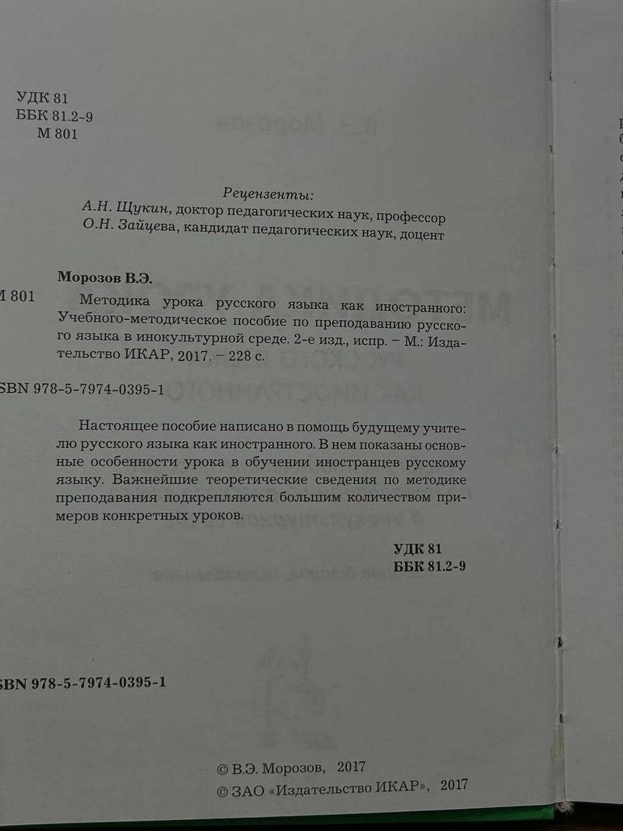 Методика урока русского языка как иностранного. Учебно-методическое пособие по преподаванию (Морозов Валерий Эдгартович); Икар, 2024